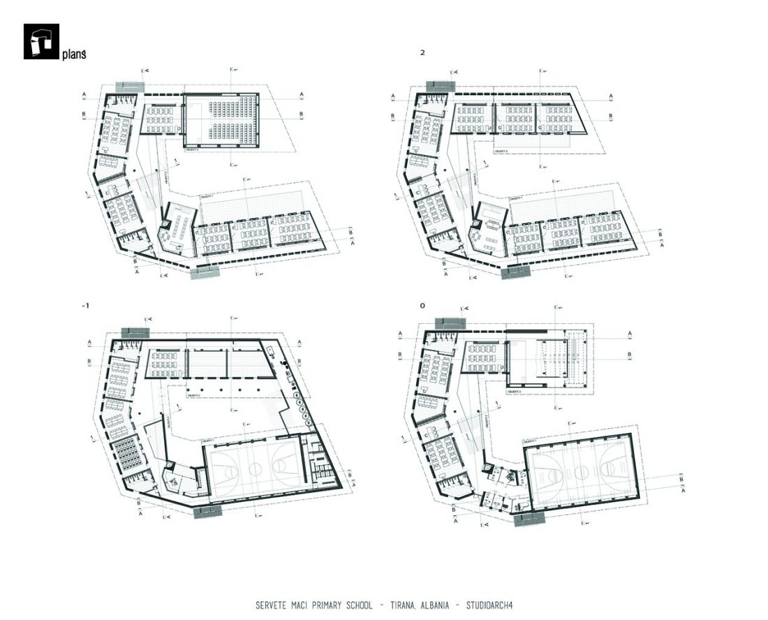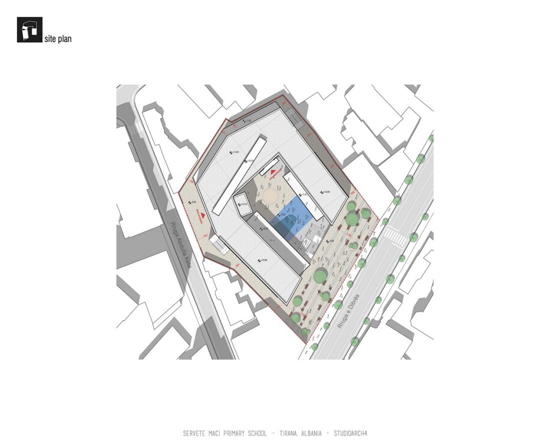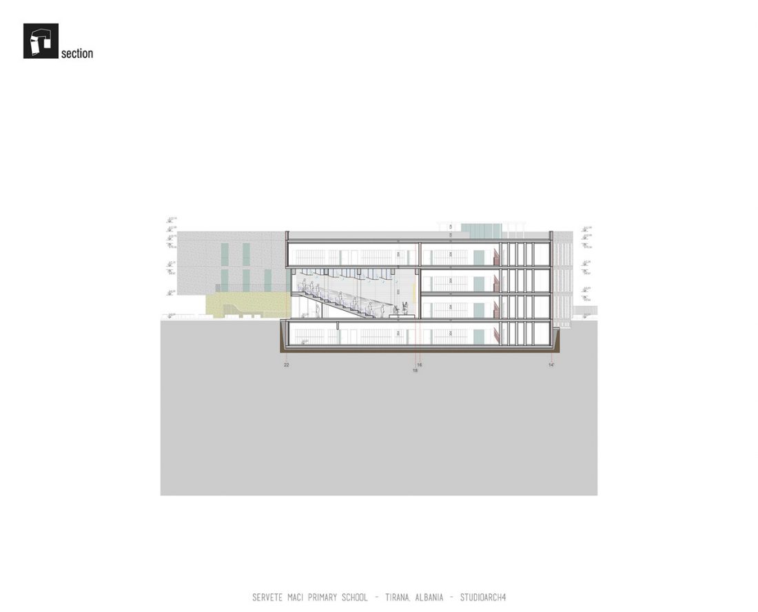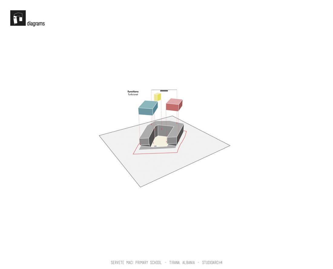 The volumetric concept of the design is based on the internal courtyard as a main feature. The whole shape of the school revolves around this courtyard. As a results, classes are positioned facing the internal courtyard therefore creating a quitter teaching space. Halls are positioned in the outer perimeter of the building.