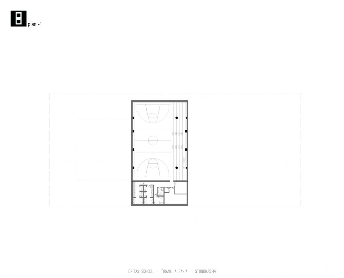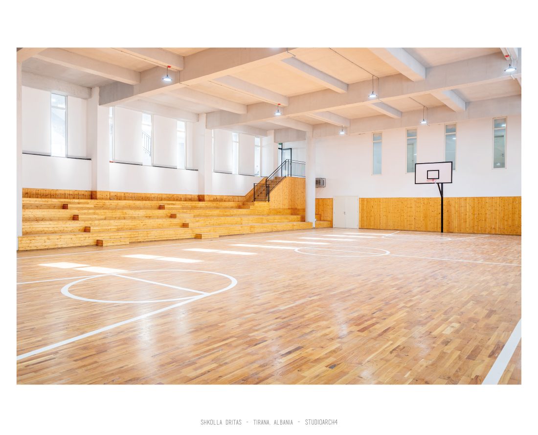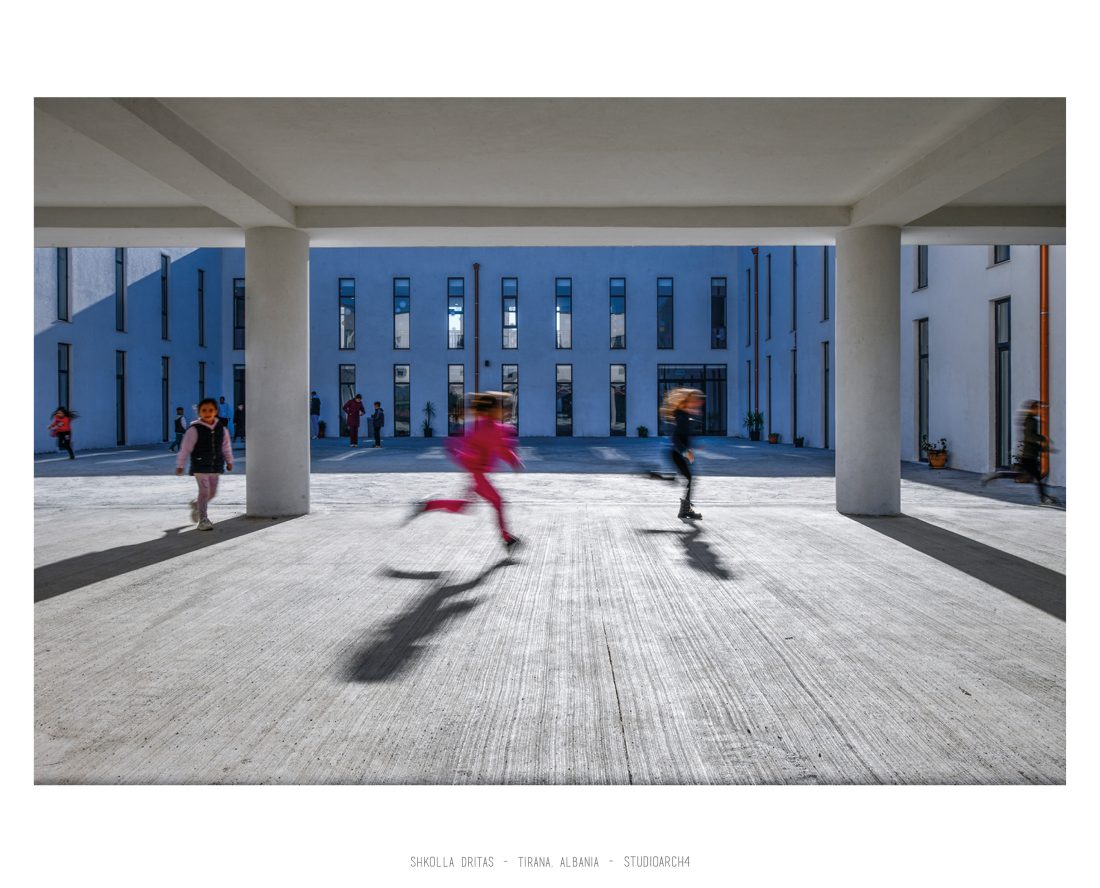 The building is 3773 m2. Outdoor courtyards and recreational spaces are of particular importance in this project where 460 m2 is the schoolyard, 360 m2 is the garden and 377 m2 is the accessible porch from the school. The school is transformed into an object of particular importance to the area because of the outdoor accommodation that can be accessed by residents. It includes a large public staircase that is interpreted as a public space. This staircase is located in the northern part of the building opposite the main entrance. In the following, a colonnade was created as a continuation of the sidewalk that can be used by community residents. In the south side of the building there is a green space.