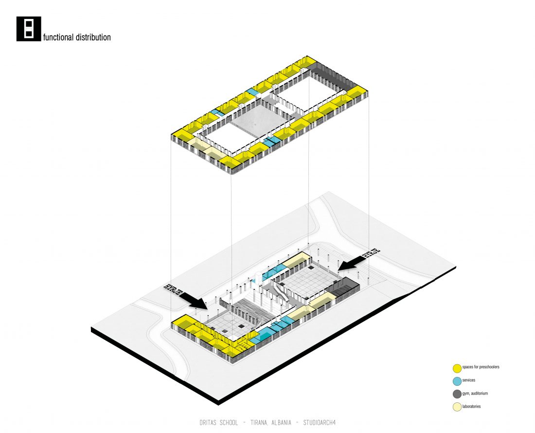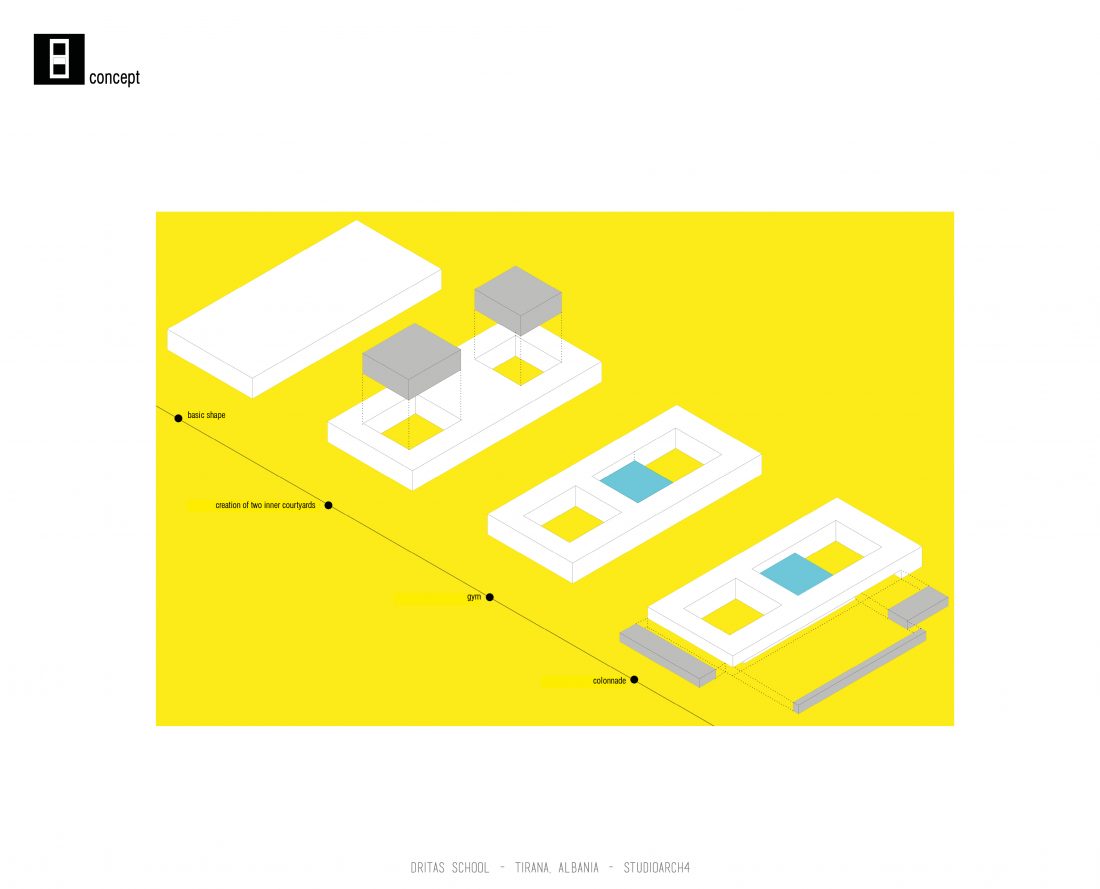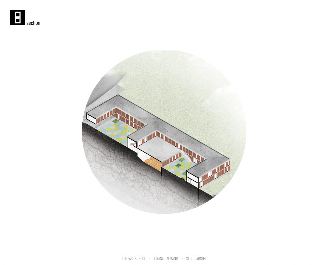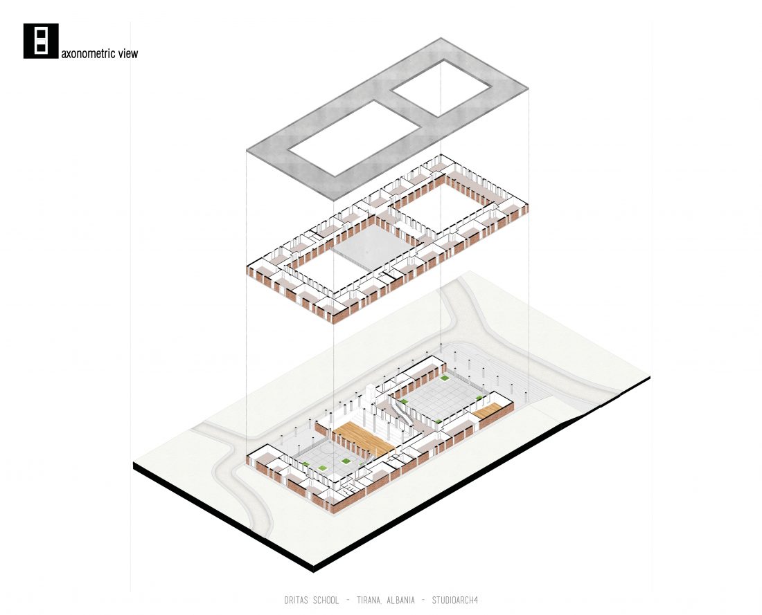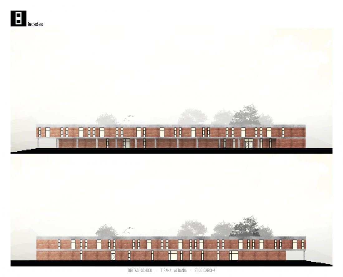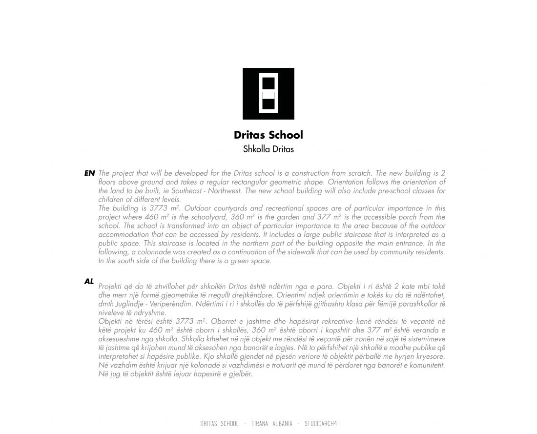 Projekti që do të zhvillohet për shkollën Dritas është ndërtim nga e para. Objekti i ri është 2 kate mbi tokë dhe merr një formë gjeometrike të rregullt drejtkëndore. Orientimi ndjek orientimin e tokës ku do të ndërtohet, dmth Juglindje – Veriperëndim. Ndërtimi i ri i shkollës do të përfshijë gjithashtu klasa për fëmijë parashkollor të niveleve të ndryshme.