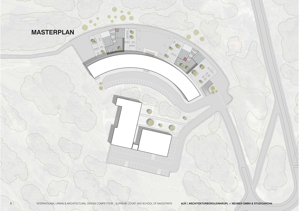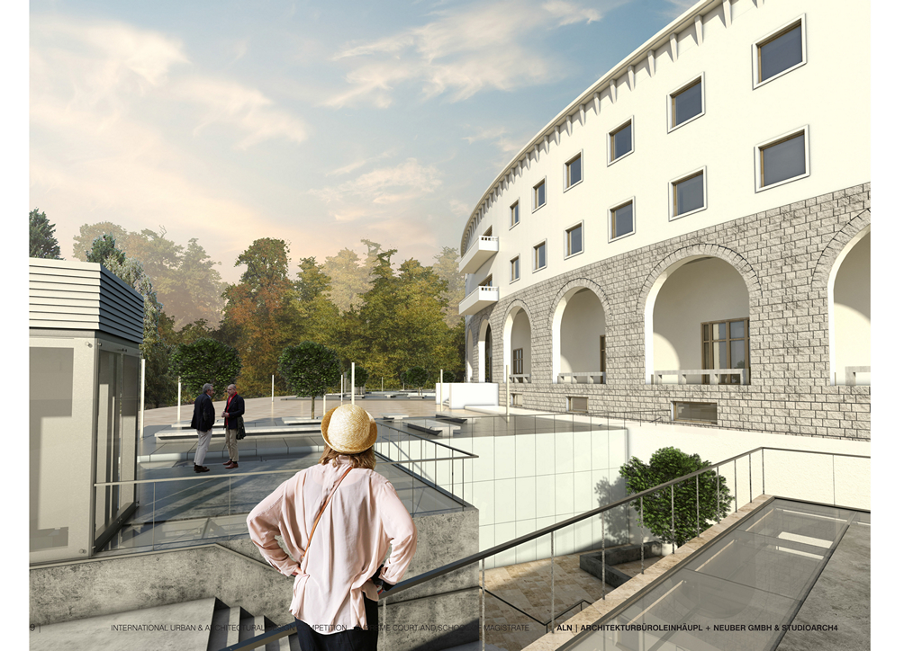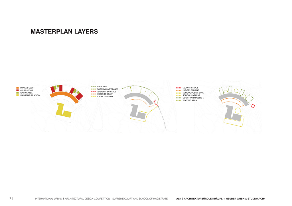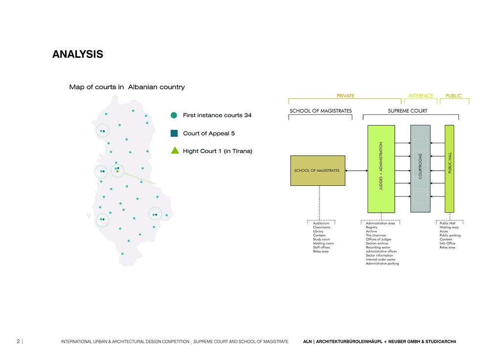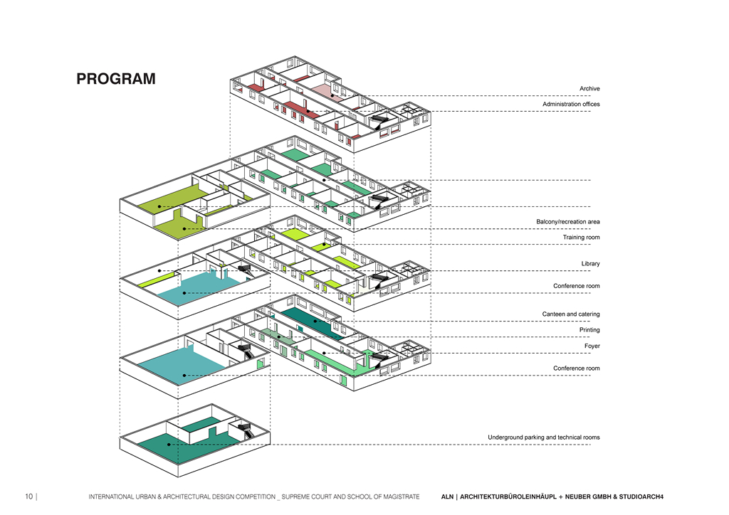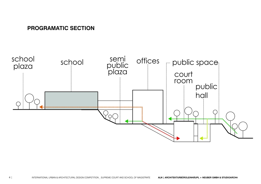 One of the approaches consists in the separation and the connection of public and private, allowing the public to penetrate into the building (the principle of transparency and openness for the citizens), but also giving to the administration and to the school the needed privacy. The structure is divided into private (administration, offices, archives), interface (courtrooms) and public. Part of the public space are the open parks (greenery), waiting areas, canteens etc. The access and the movement is organized in order to provide this division of private/