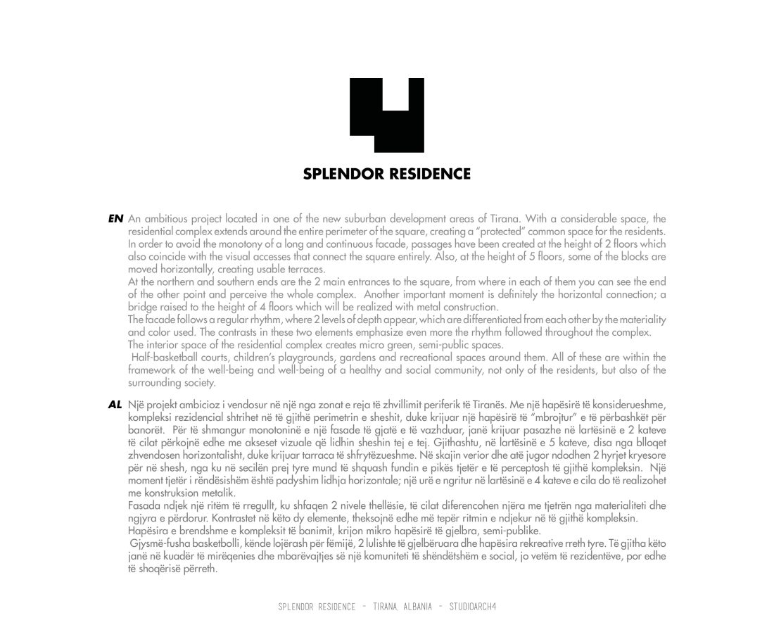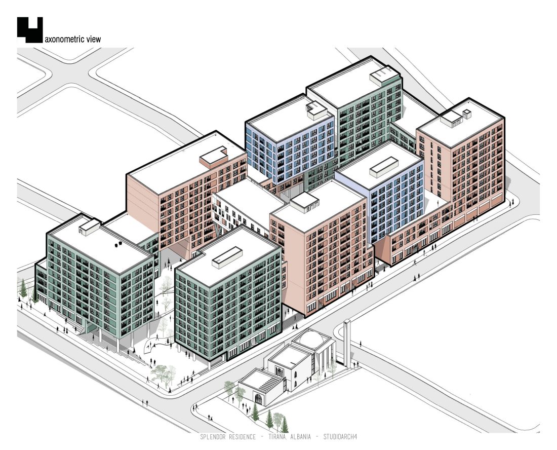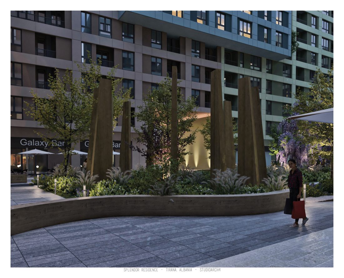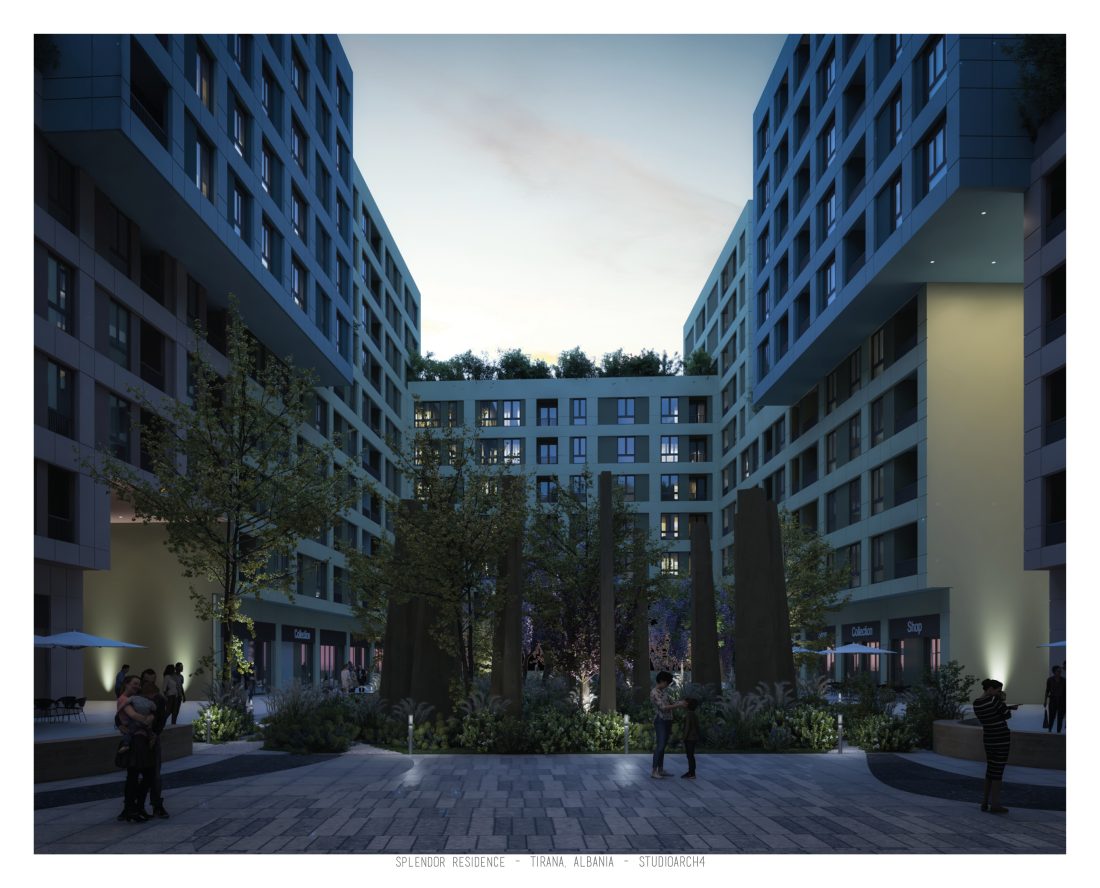 Një projekt ambicioz i vendosur në një nga zonat e reja të zhvillimit periferik të Tiranës. Me një hapësirë të konsiderueshme, kompleksi rezidencial shtrihet në të gjithë perimetrin e sheshit, duke krijuar një hapësirë të “mbrojtur” e të përbashkët për banorët. Për të shmangur monotoninë e një fasade të gjatë e të vazhduar, janë krijuar pasazhe në lartësinë e 2 kateve të cilat përkojnë edhe me akseset vizuale që lidhin sheshin tej e tej. Gjithashtu, në lartësinë e 5 kateve, disa nga blloqet zhvendosen horizontalisht, duke krijuar tarraca të shfrytëzueshme. Në skajin verior dhe atë jugor ndodhen 2 hyrjet kryesore për në shesh, nga ku në secilën prej tyre mund të shquash fundin e pikës tjetër e të perceptosh të gjithë kompleksin. Një moment tjetër i rëndësishëm është padyshim lidhja horizontale; një urë e ngritur në lartësinë e 4 kateve e cila do të realizohet