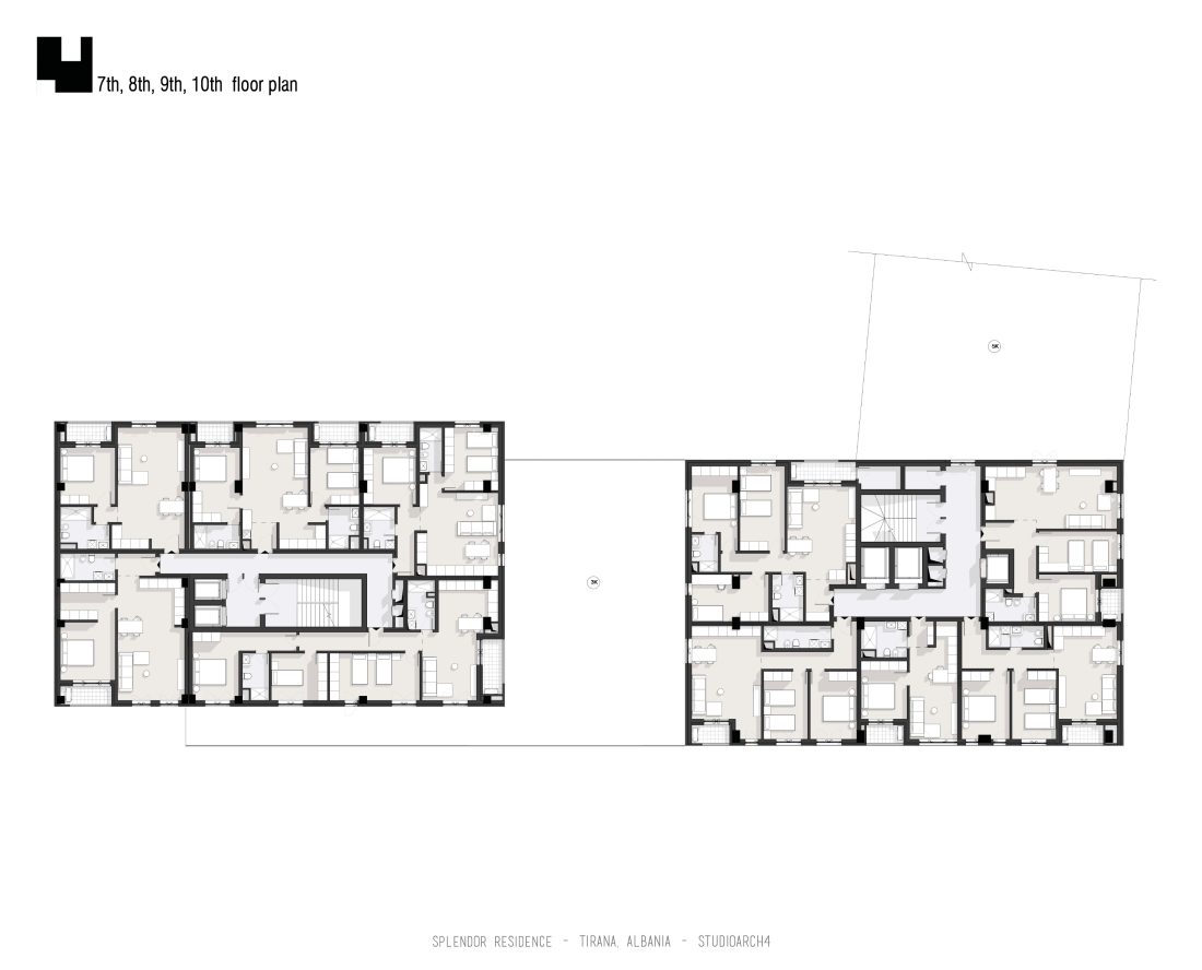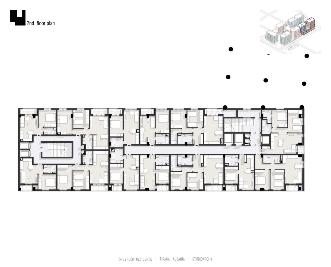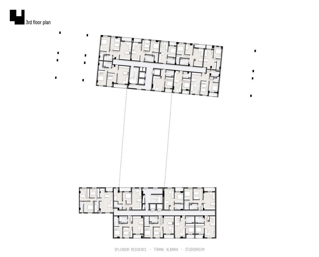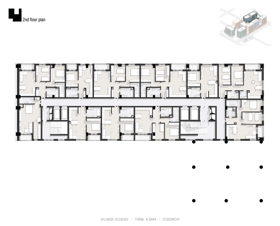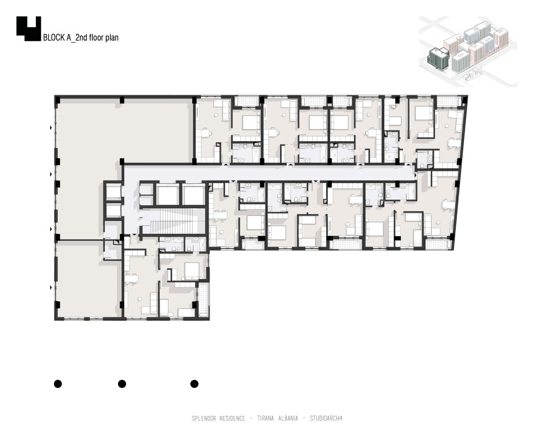 Një projekt ambicioz i vendosur në një nga zonat e reja të zhvillimit periferik të Tiranës. Me një hapësirë të konsiderueshme, kompleksi rezidencial shtrihet në të gjithë perimetrin e sheshit, duke krijuar një hapësirë të “mbrojtur” e të përbashkët për banorët. Për të shmangur monotoninë e një fasade të gjatë e të vazhduar, janë krijuar pasazhe në lartësinë e 2 kateve të cilat përkojnë edhe me akseset vizuale që lidhin sheshin tej e tej. Gjithashtu, në lartësinë e 5 kateve, disa nga blloqet zhvendosen horizontalisht, duke krijuar tarraca të shfrytëzueshme. Në skajin verior dhe atë jugor ndodhen 2 hyrjet kryesore për në shesh, nga ku në secilën prej tyre mund të shquash fundin e pikës tjetër e të perceptosh të gjithë kompleksin. Një moment tjetër i rëndësishëm është padyshim lidhja horizontale; një urë e ngritur në lartësinë e 4 kateve e cila do të realizohet