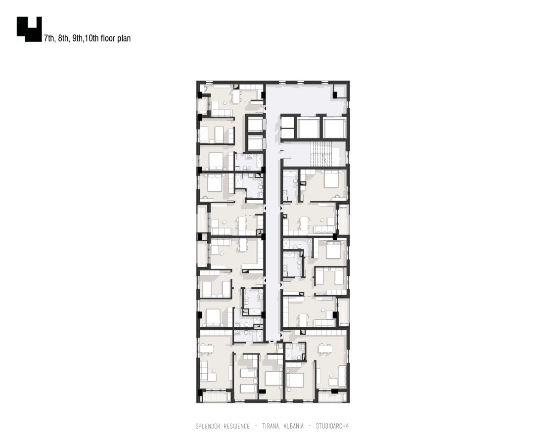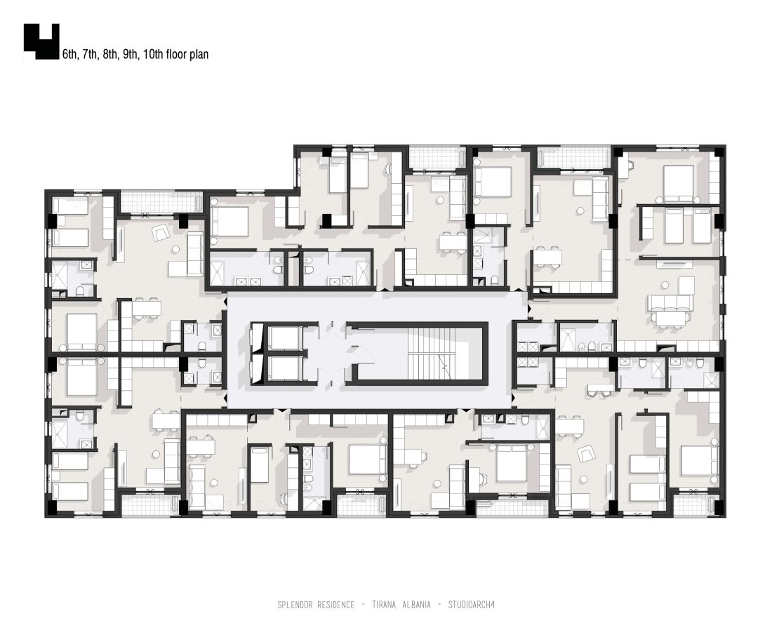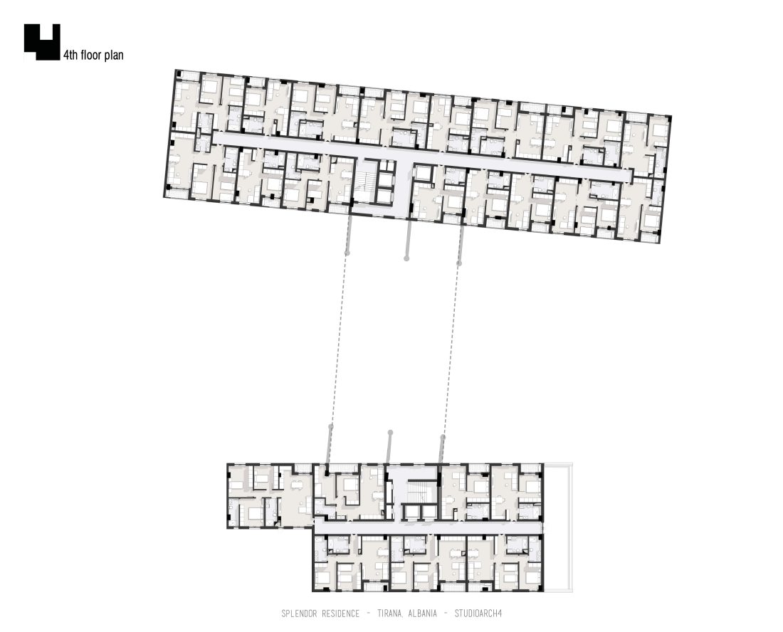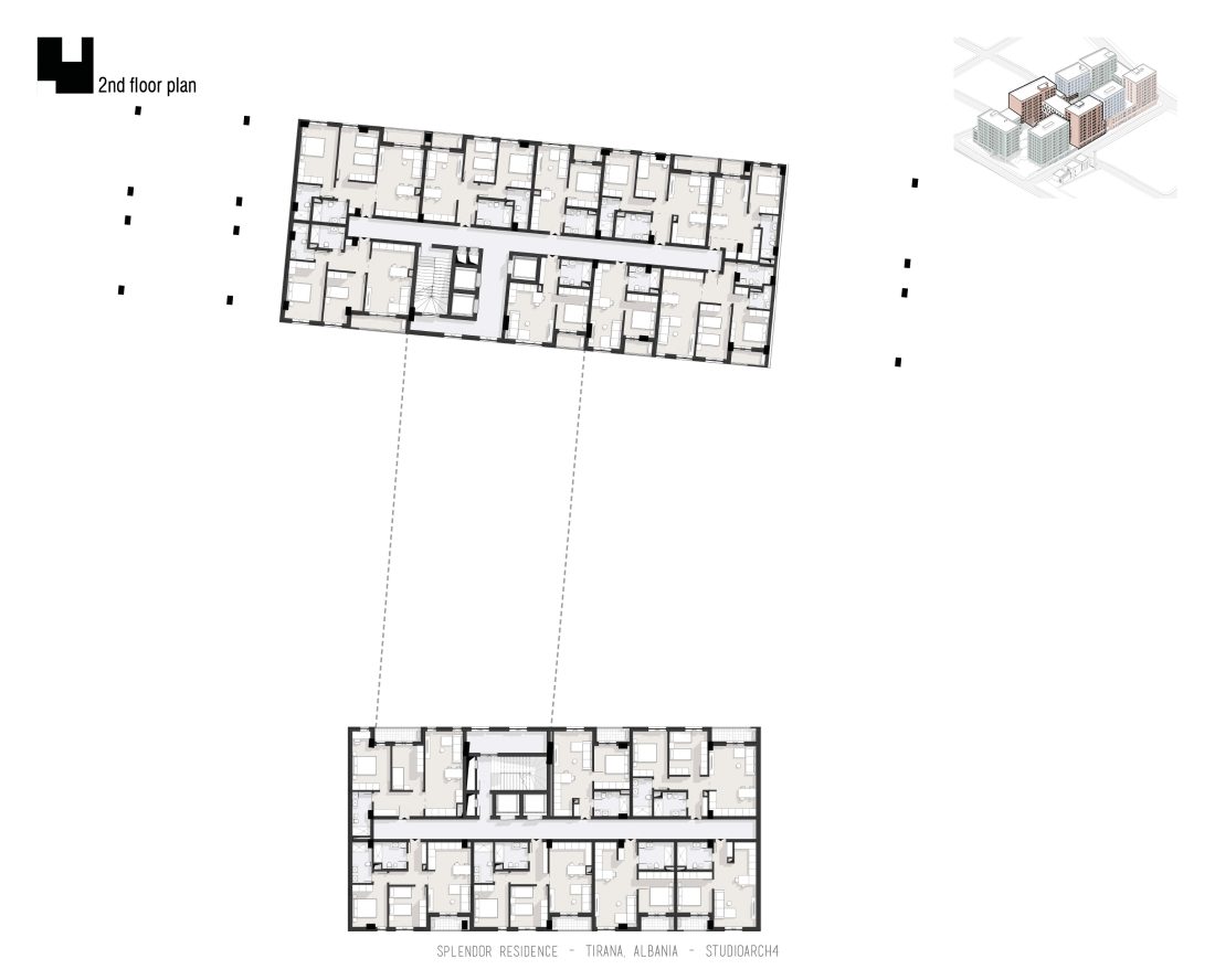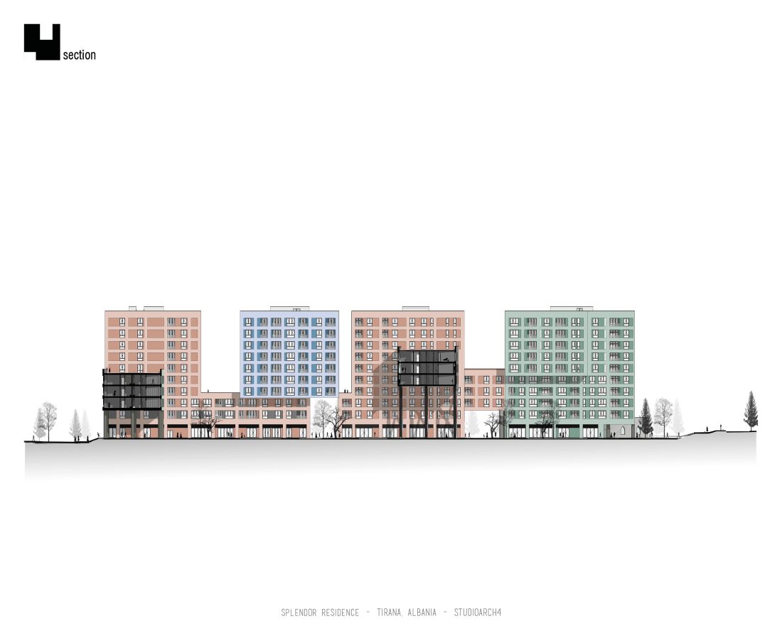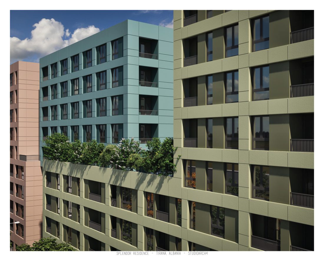 An ambitious project located in one of the new suburban development areas of Tirana. With a considerable space, the residential complex extends around the entire perimeter of the square, creating a “protected” common space for the residents. In order to avoid the monotony of a long and continuous facade, passages have been created at the height of 2 floors which also coincide with the visual accesses that connect the square entirely. Also, at the height of 5 floors, some of the blocks are moved horizontally, creating usable terraces. At the northern and southern ends are the 2 main entrances to the square, from where in each of them you can see the end of the other point and perceive the whole complex. Another important moment is definitely the horizontal connection; a bridge raised to the height of 4 floors which will be realized with metal construction. The facade follows a regular rhythm, where 2 levels of depth appear, which are differentiated from each other by the materiality and color used. The contrasts in these two elements emphasize even more the rhythm followed throughout the complex. The interior space of the residential complex creates micro green, semi-public spaces. Half-basketball courts, children’s playgrounds, gardens and recreational spaces around them. All of these are within the framework of the well-being and well-being of a healthy and social community, not only of the residents, but also of the surrounding society.