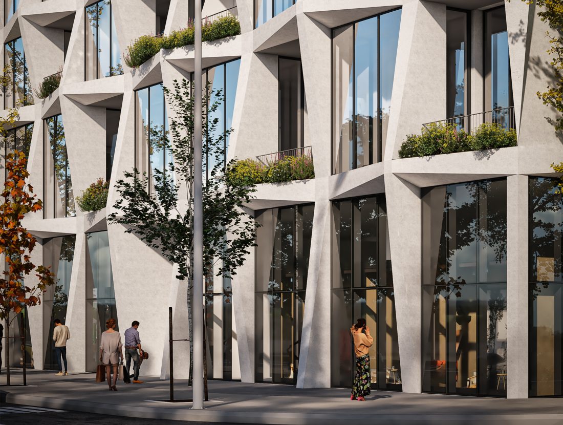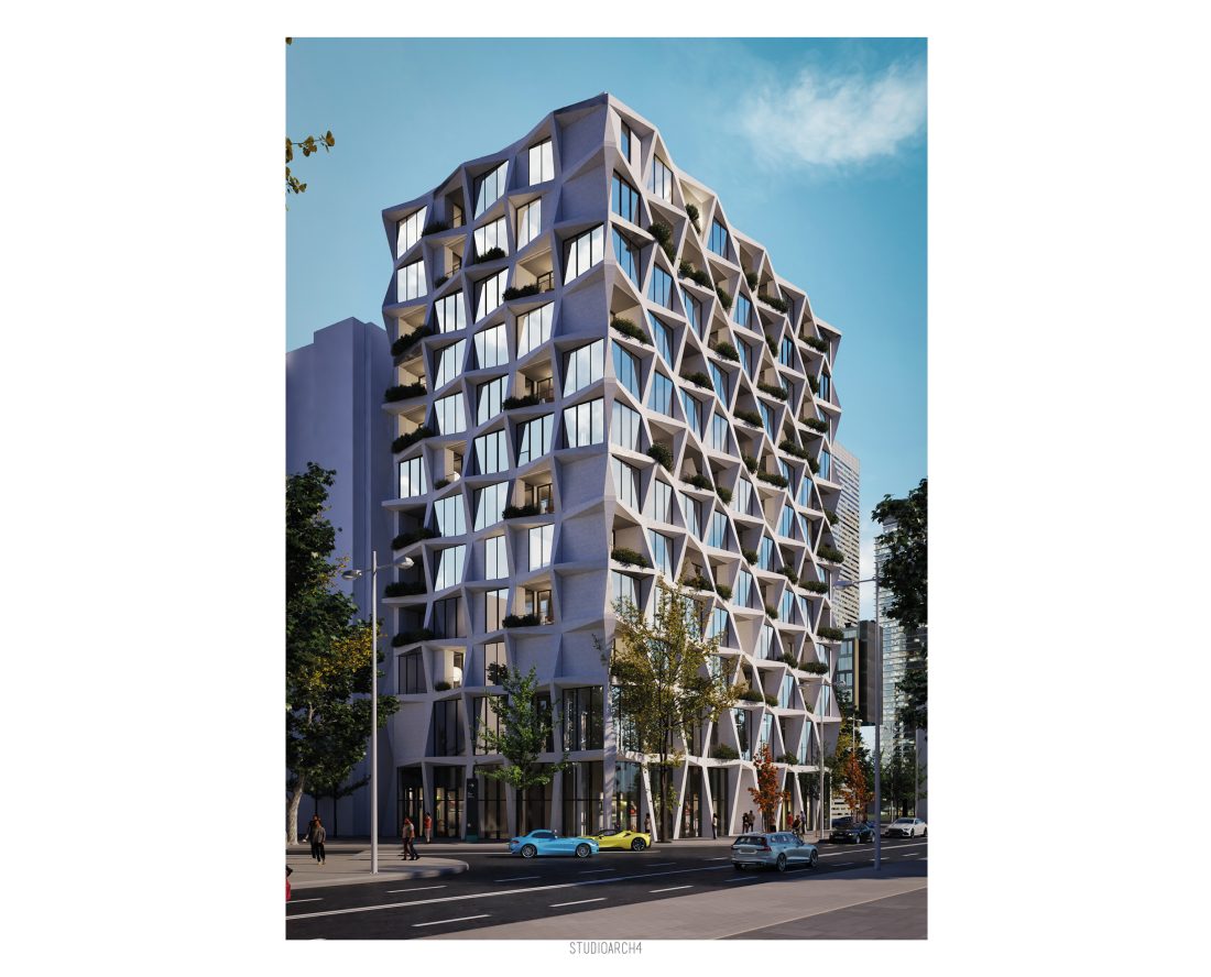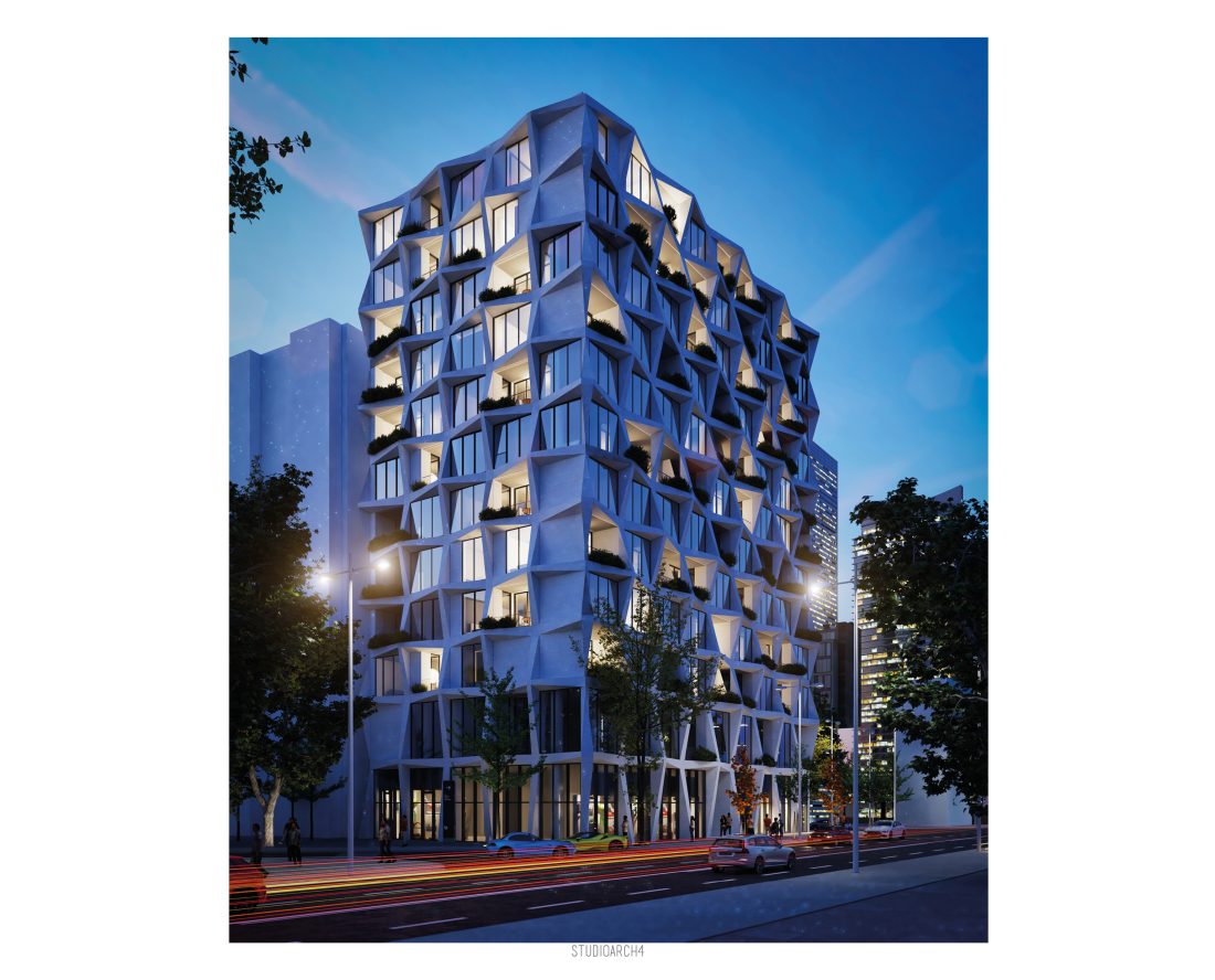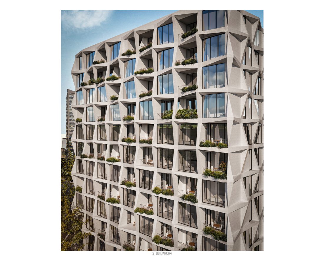 facade, which is proposed with prefabricated elements composed in triangular shapes that create a very interesting