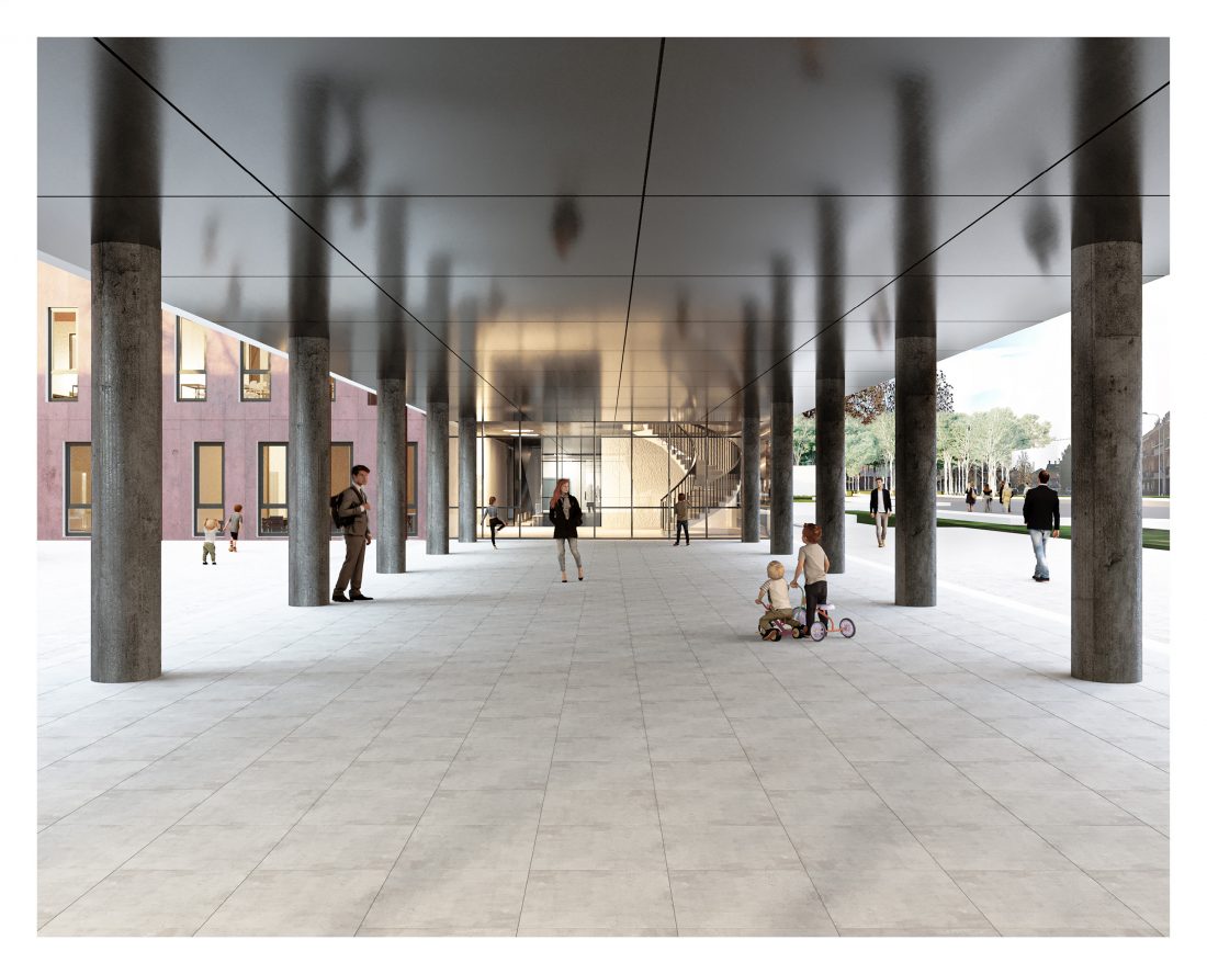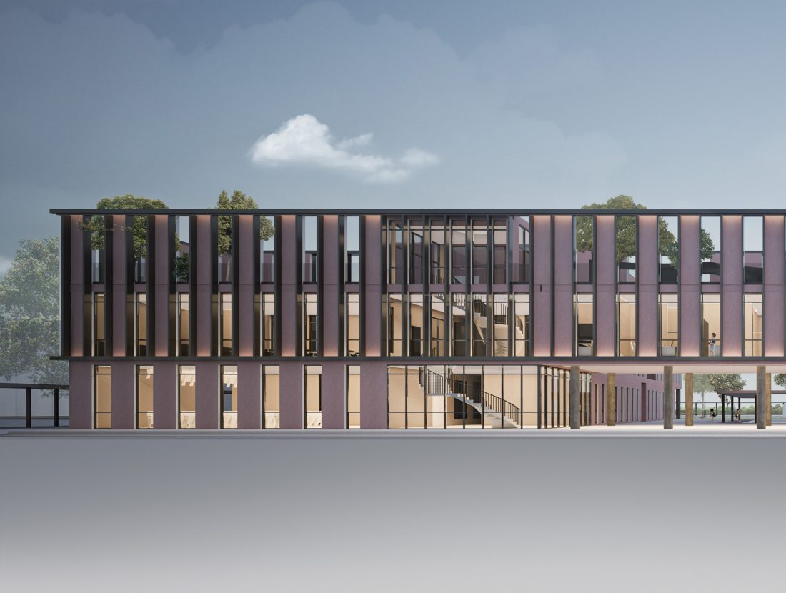 main road is on the highest level. The main lobby atriums and openings vertical lines create an inviting transparency towards the internal spaces of the building. At the two ends of this volume are the auditorium and the library, which they serve also the community. From the main lobby, students are distributed