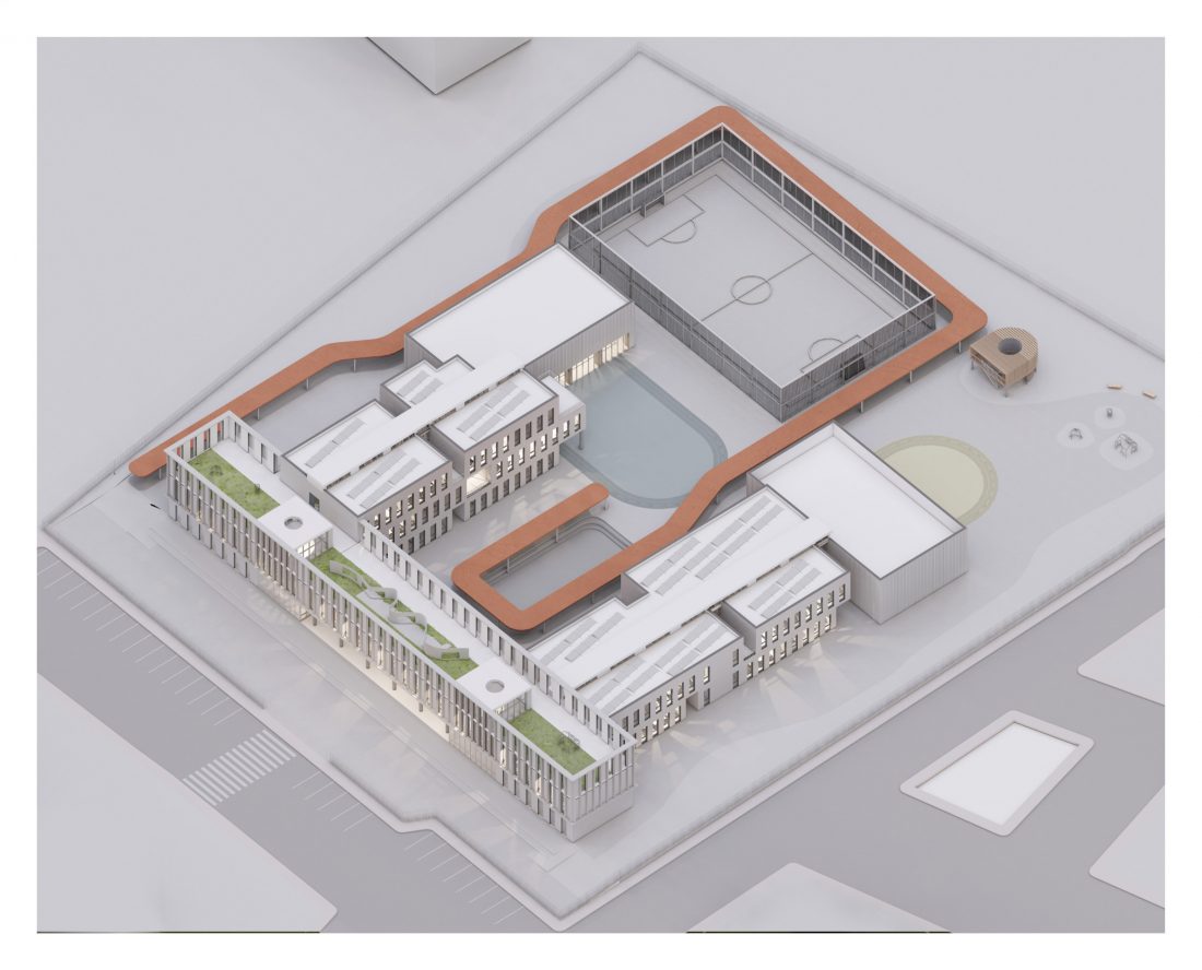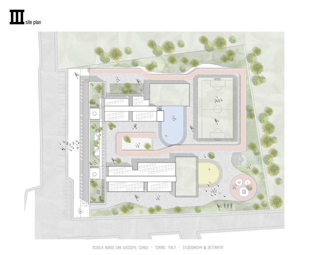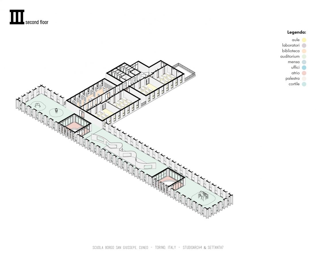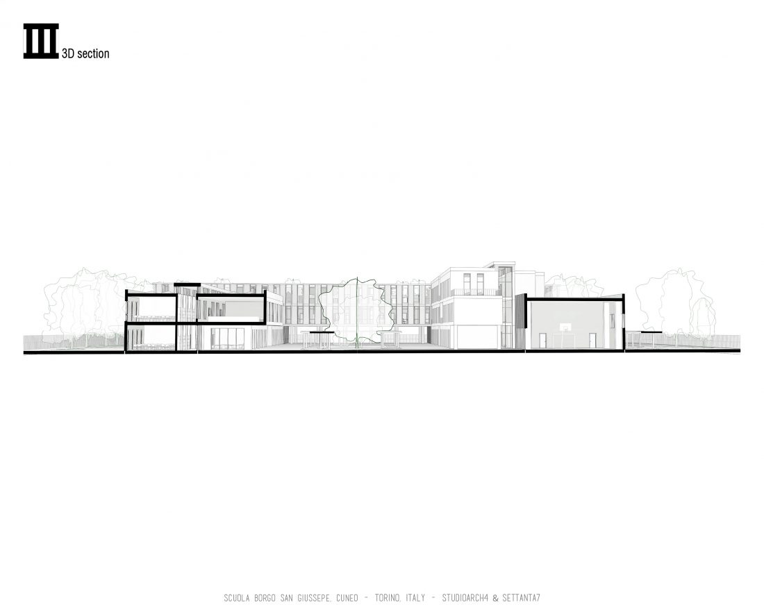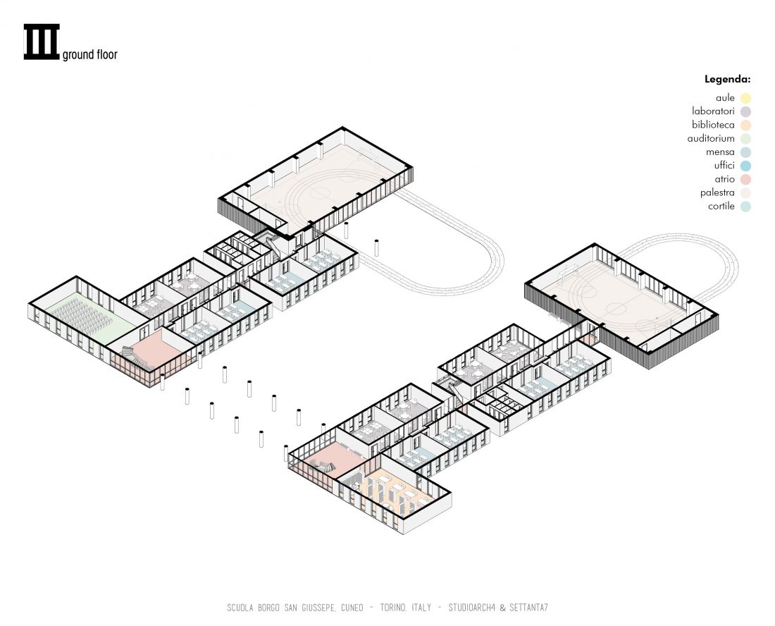 This project proposal was done in close collaboration with the Italian Architecture Studio Settanta 7. This was one of hundreds of projects that are up for reconstruction in the region of Italy, this one specifically being in Cuneo province. The primary school and the gymnasium are parallel to each other, in two longitudinal volumes, in which all the services and requirements necessary for development are developed learning and social, interactive. The main entrance to the institute is made by the connecting façade to the South-West, which compared to the