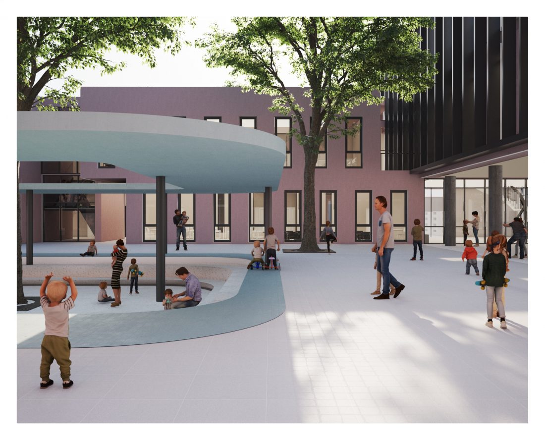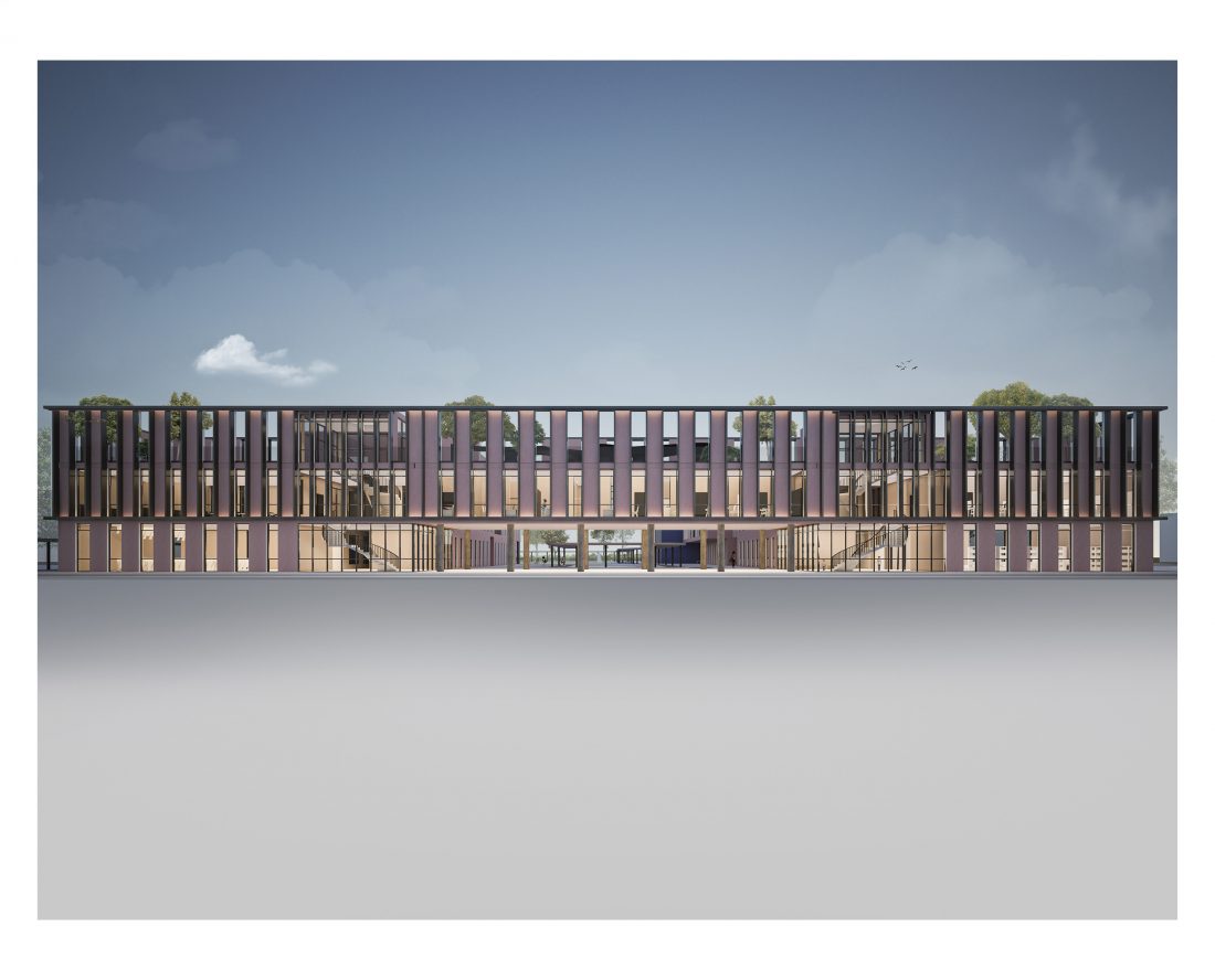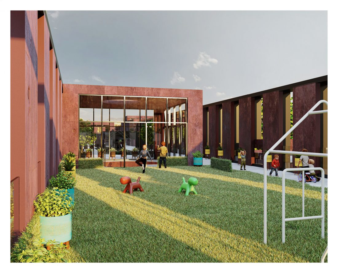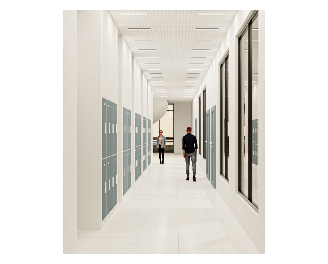to their respective buildings. The classrooms are all oriented in the South-East direction, allowing natural lighting during all hours of educational development. At the end of these two volumes, the respective gyms are located, too connected to the school’s outdoor courtyard, creating an interactive indoor environment-