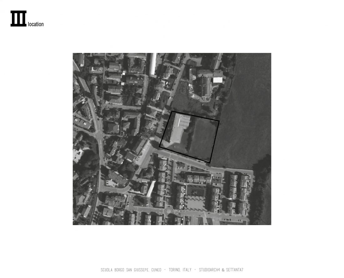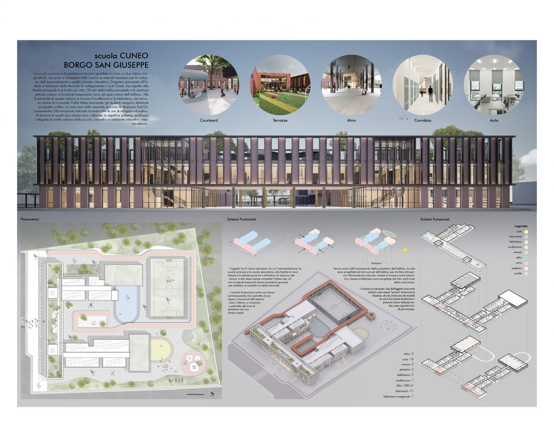 Ky projekt propozim eshte bere ne bashkepunim te afert me studion Italiane Settanta 7. Ky ishte nje nga qindra projektet e shkollave qe jane propozuar per rikonstruksion ne Itali, me kete projekt vendosur specifikisht ne provincen e Cuneo. Shkolla fillore dhe gjimnazi janë paralel me njëri-tjetrin, në dy vëllime gjatësore, në të cilin zhvillohen të gjitha shërbimet dhe kërkesat e nevojshme për zhvillim mësimore dhe sociale, ndërvepruese. Hyrja kryesore e institutit është bërë nga fasada lidhëse në Jug-Perëndim, e cila në krahasim me rruga kryesore eshte ne nivelin me te larte. Atriumet dhe hapjet kryesore të hollit Linjat vertikale krijojnë një transparencë tërheqëse ndaj hapësirave të brendshme të ndërtesës. Në dy skajet e këtij vëllimi janë auditori dhe biblioteka, të cilave u shërbejnë edhe komunitetin. Nga holli kryesor shpërndahen studentët në ndërtesat e tyre përkatëse. Klasat janë të gjitha të orientuara në drejtimin Jug-Lindje, duke lejuar ndriçimin natyral gjatë të gjitha orëve të zhvillimit arsimor. Në fund të këtyre dy vëllimeve janë vendosur edhe palestrat përkatëse e lidhur me oborrin e jashtëm të shkollës, duke krijuar një mjedis interaktiv të brendshëm e jashtme.