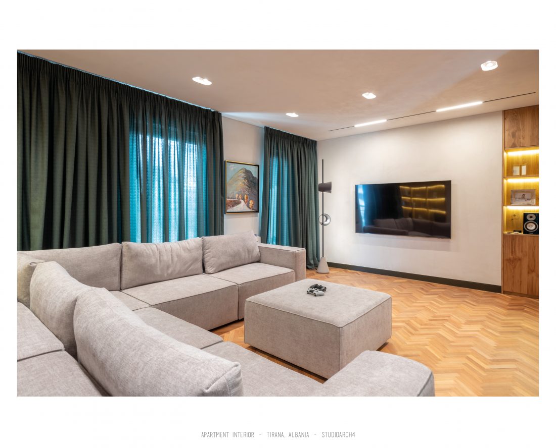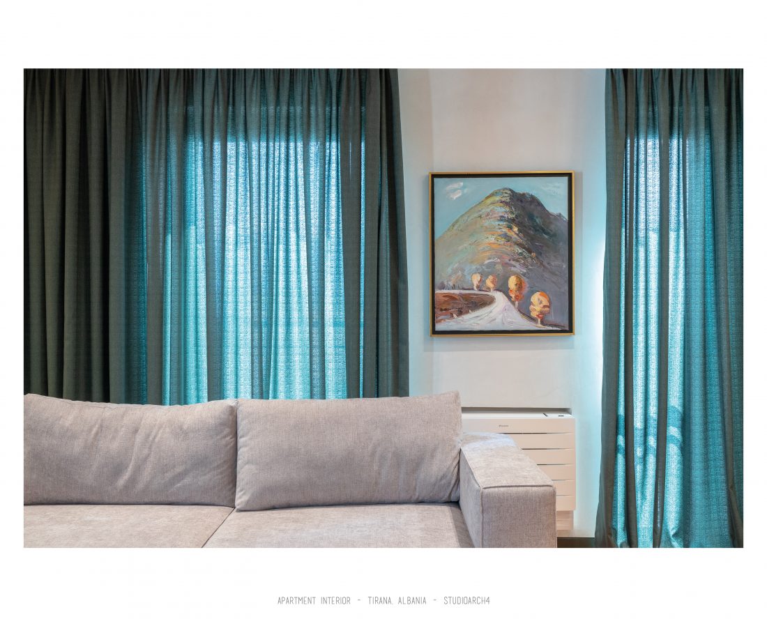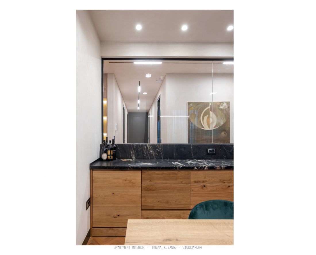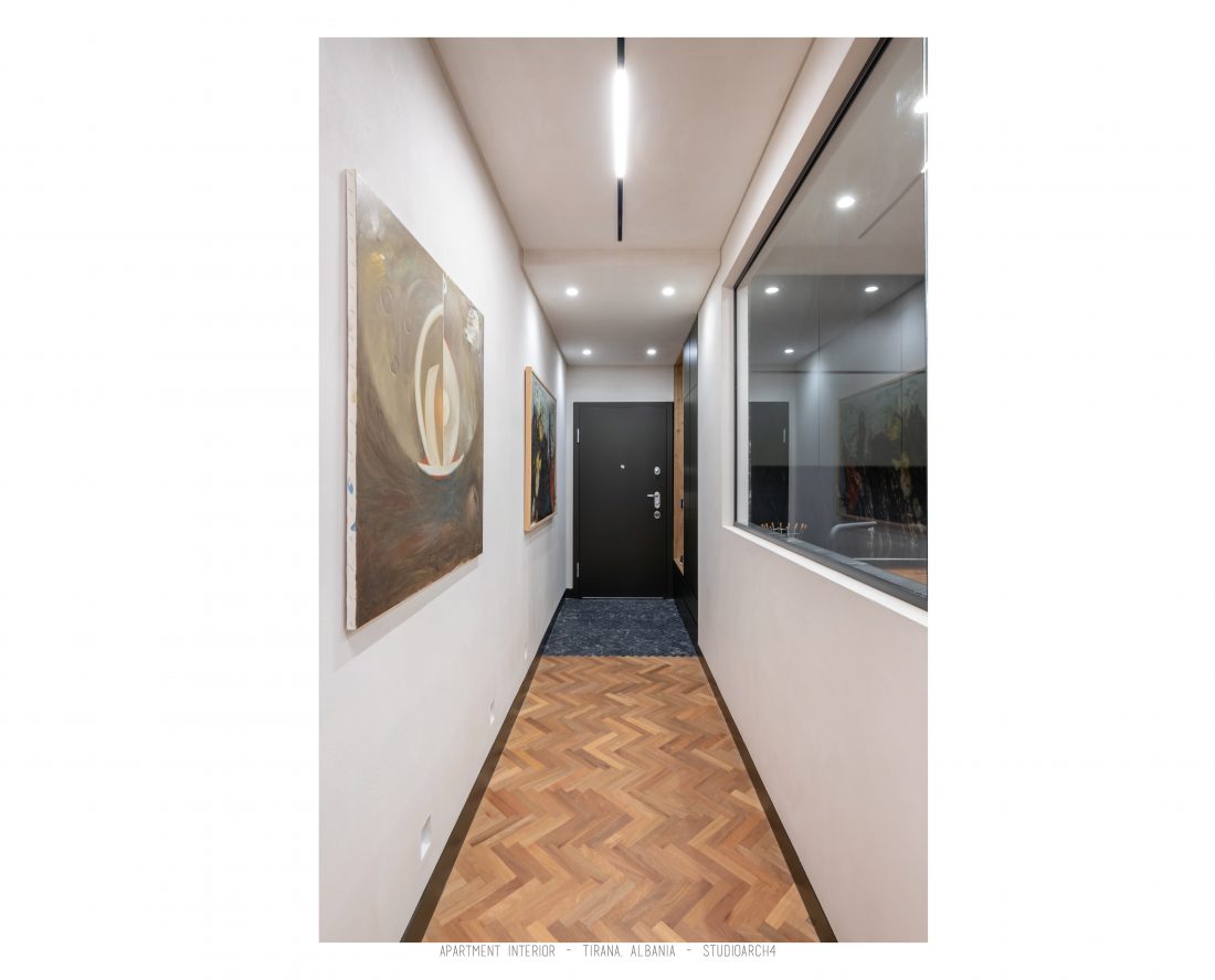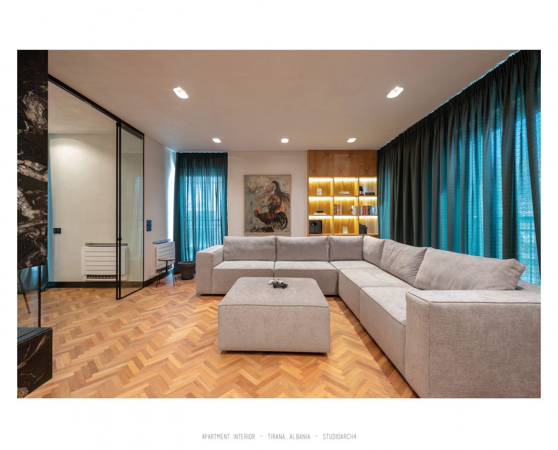 Apartamenti ka një siperfaqe prej 158 m2, i përshtatshëm për një ndarje funksionale 3+1. Funksionet ndahen në dhomë ndenje dhe kuzhine, dhe 3 dhoma gjumi, një prej të cilave ka dhe garderobe “walk-in” te inkorporuar, dhe 2 tualete. Apartamenti ka elementë të fortë vizual në materializimin e mobilieve dhe në aksesoret plotësues të tij. Mobiljet janë trajtuar me dru lisi duke prezantuar në paletën përbërëse të apartamentit një ngjyrë të ngrohtë që kombinohet lehtësisht me parketin e përzgjedhur. Aksesorët e apartamentit, si kornizimet, pikturat dhe perdet janë propozuar me ngjyra të ftohta për të krijuar një kontrast me ngrohtesinë që krijon ngjyra e mobiljeve dhe parketit. Në mobilim është aplikuar koncepti i rafteve të ekspozuara si në koridor ashtu dhe në ndenje, dhe mbetet i thjeshtë në trajtim duke ndjekur linja të drejta. Ndiçmi është përdorur gjithashtu si një element personifikues i apartamentit, ku shihet kombinimi i spoteve, ndriçuesve të varur dhe shinave tavanore dhe murale. Keto të fundit janë kompozuar në kombinim me njëra tjetrën për të krijuar shiritë të pandërprerë në faqet e mureve të gipsit – trajtim i cili thekson vëmëndjen në ambjente specifike të apartamentit.