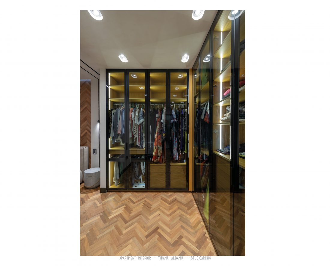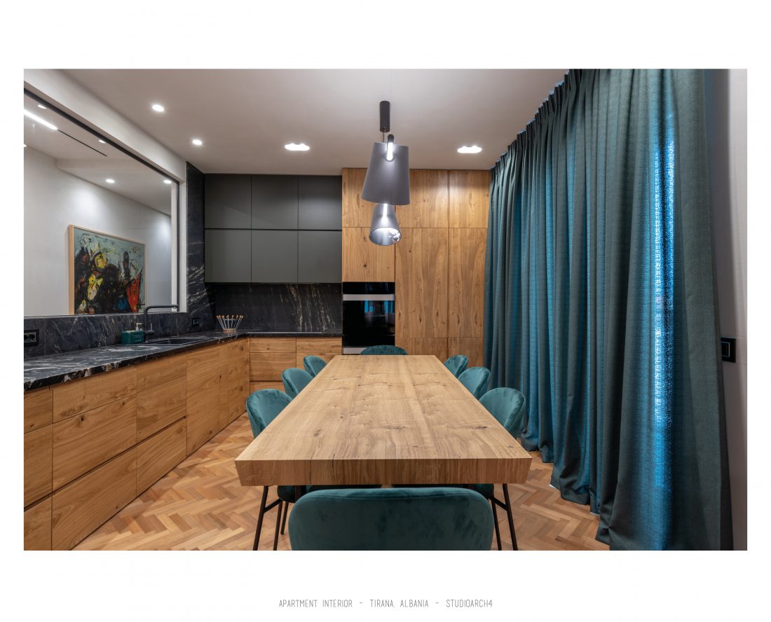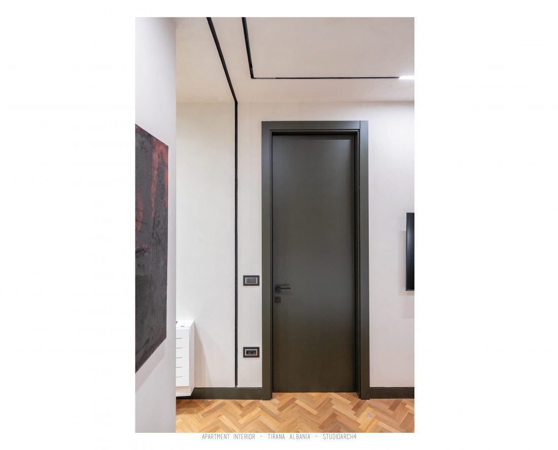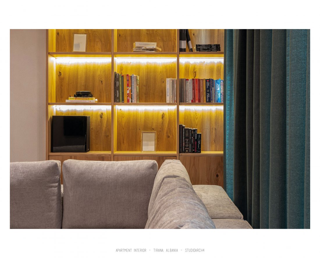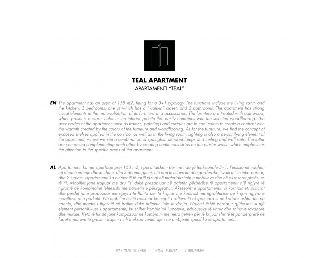 Apartamenti ka një siperfaqe prej 158 m2, i përshtatshëm për një ndarje funksionale 3+1. Funksionet ndahen në dhomë ndenje dhe kuzhine, dhe 3 dhoma gjumi, një prej të cilave ka dhe garderobe “walk-in” te inkorporuar, dhe 2 tualete. Apartamenti ka elementë të fortë vizual në materializimin e mobilieve dhe në aksesoret plotësues të tij. Mobiljet janë trajtuar me dru lisi duke prezantuar në paletën përbërëse të apartamentit një ngjyrë të ngrohtë që kombinohet lehtësisht me parketin e përzgjedhur. Aksesorët e apartamentit, si kornizimet, pikturat dhe perdet janë propozuar me ngjyra të ftohta për të krijuar një kontrast me ngrohtesinë që krijon ngjyra e mobiljeve dhe parketit. Në mobilim është aplikuar koncepti i rafteve të ekspozuara si në koridor ashtu dhe në ndenje, dhe mbetet i thjeshtë në trajtim duke ndjekur linja të drejta. Ndiçmi është përdorur gjithashtu si një element personifikues i apartamentit, ku shihet kombinimi i spoteve, ndriçuesve të varur dhe shinave tavanore dhe murale. Keto të fundit janë kompozuar në kombinim me njëra tjetrën për të krijuar shiritë të pandërprerë në faqet e mureve të gipsit – trajtim i cili thekson vëmëndjen në ambjente specifike të apartamentit.