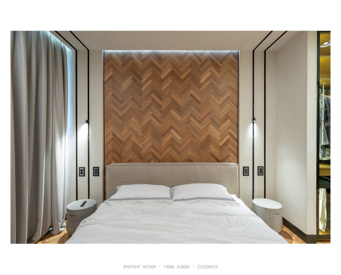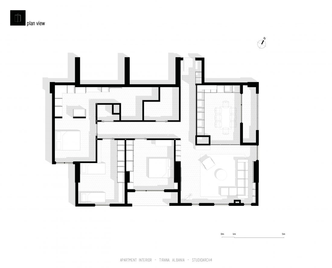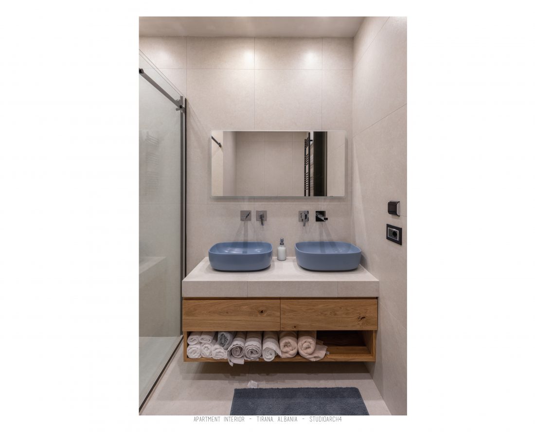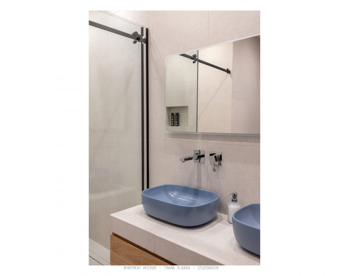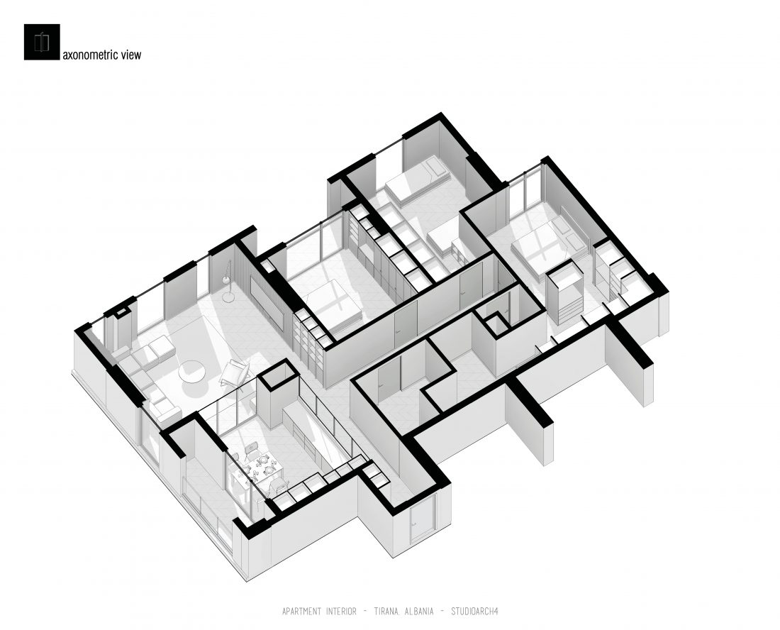 Apartamenti ka një siperfaqe prej 158 m2, i përshtatshëm për një ndarje funksionale 3+1. Funksionet ndahen në dhomë ndenje dhe kuzhine, dhe 3 dhoma gjumi, një prej të cilave ka dhe garderobe “walk-in” te inkorporuar, dhe 2 tualete. Apartamenti ka elementë të fortë vizual në materializimin e mobilieve dhe në aksesoret plotësues të tij. Mobiljet janë trajtuar me dru lisi duke prezantuar në paletën përbërëse të apartamentit një ngjyrë të ngrohtë që kombinohet lehtësisht me parketin e përzgjedhur. Aksesorët e apartamentit, si kornizimet, pikturat dhe perdet janë propozuar me ngjyra të ftohta për të krijuar një kontrast me ngrohtesinë që krijon ngjyra e mobiljeve dhe parketit. Në mobilim është aplikuar koncepti i rafteve të ekspozuara si në koridor ashtu dhe në ndenje, dhe mbetet i thjeshtë në trajtim duke ndjekur linja të drejta. Ndiçmi është përdorur gjithashtu si një element personifikues i apartamentit, ku shihet kombinimi i spoteve, ndriçuesve të varur dhe shinave tavanore dhe murale. Keto të fundit janë kompozuar në kombinim me njëra tjetrën për të krijuar shiritë të pandërprerë në faqet e mureve të gipsit – trajtim i cili thekson vëmëndjen në ambjente specifike të apartamentit.
