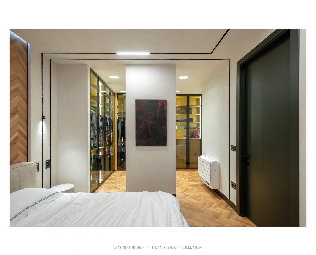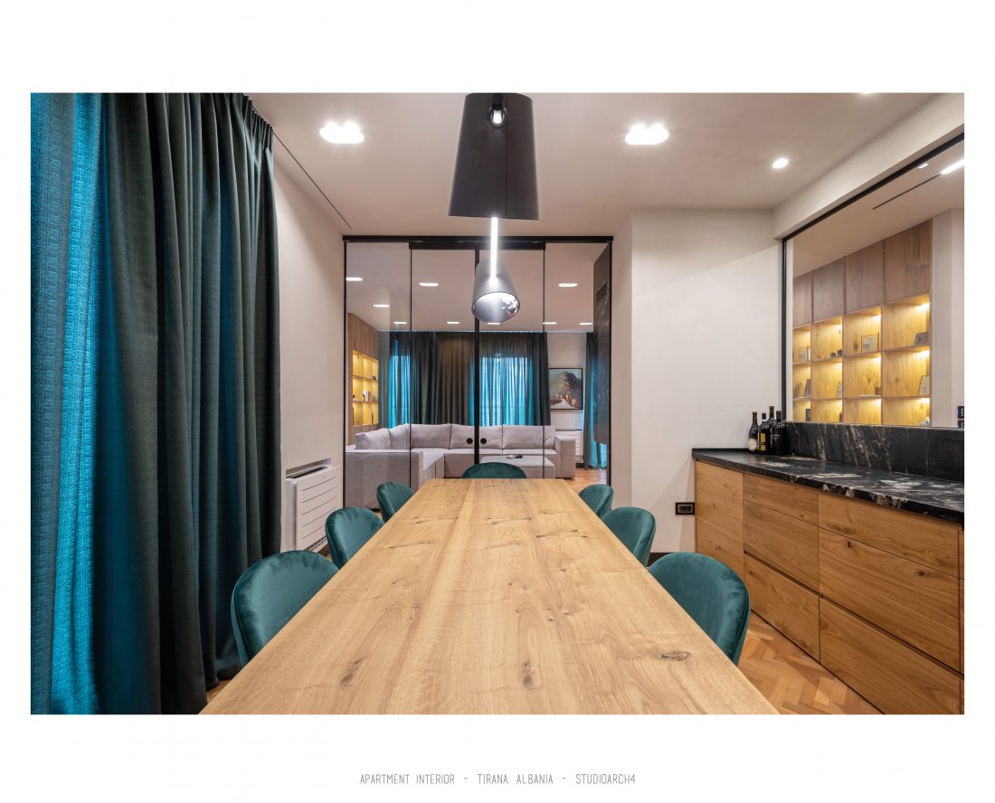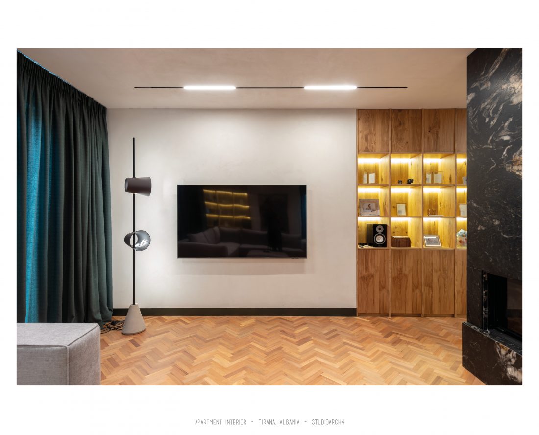 The apartment has an area of 158 m2, fitting for a 3+1 typology The functions include the living room and the kitchen, 3 bedrooms, one of which has a “walk-in” closet, and 2 bathrooms. The apartment has strong visual elements in the materialization of its furniture and accessories. The furniture are treated with oak wood, which presents a warm color in the interior palette that easily combines with the selected wood flooring. The accessories of the apartment, such as frames, paintings and curtains are in cool colors to create a contrast with the warmth created by the colors of the furniture and wood flooring. As for the furniture, the concept of exposed shelves is applied in the corridor as well as in the living room. Lighting is also a personifying element of the apartment, where we see a combination of spotlights, pendant lamps and ceiling and wall rails. The latter are composed complementing each other by creating continuous strips on the plaster walls – which emphasizes the attention to the specific areas of the apartment.
