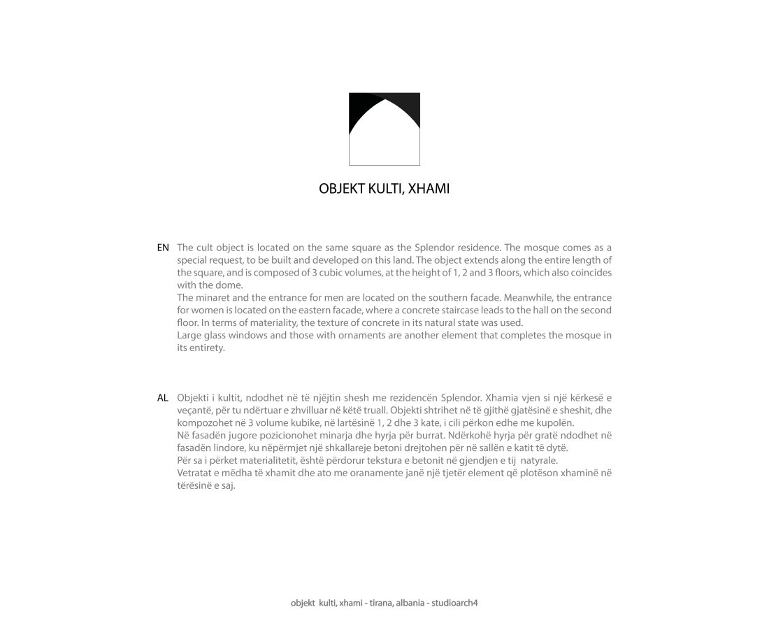 Objekti i kultit, ndodhet në të njëjtin shesh me rezidencën Splendor. Xhamia vjen si një kërkesë e