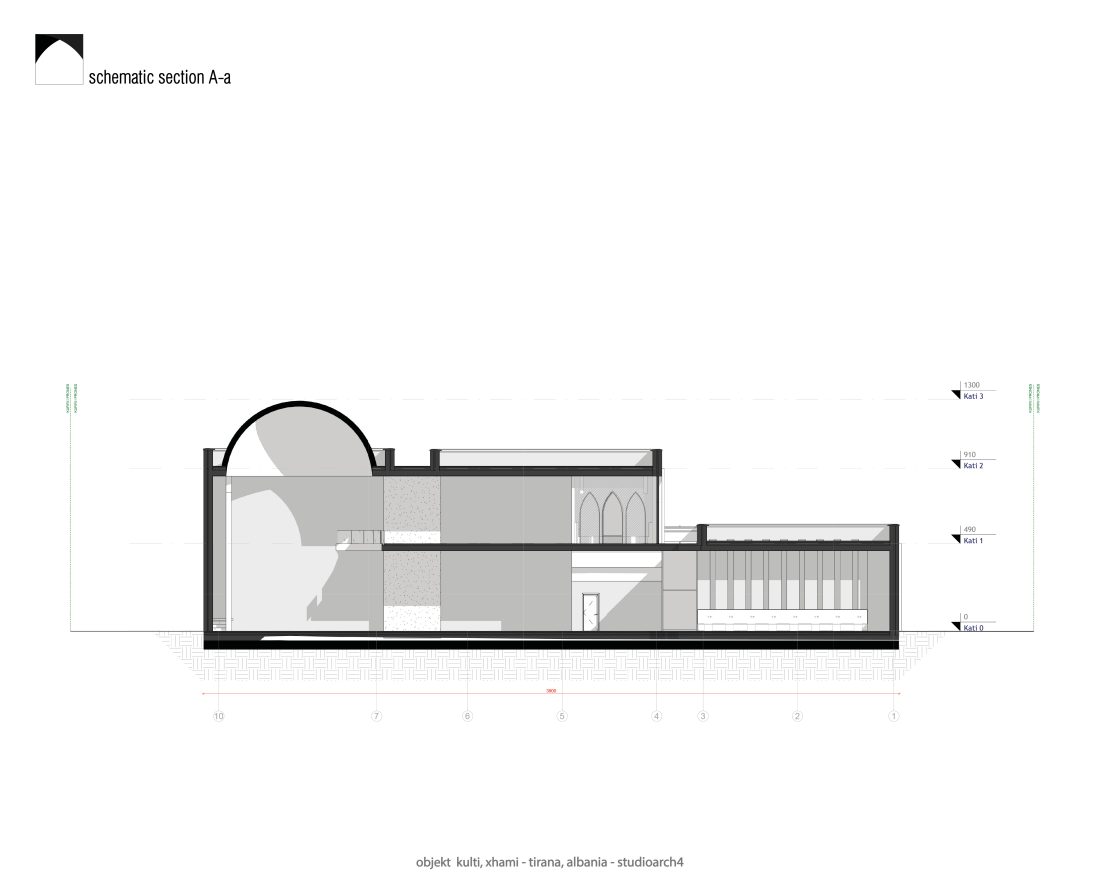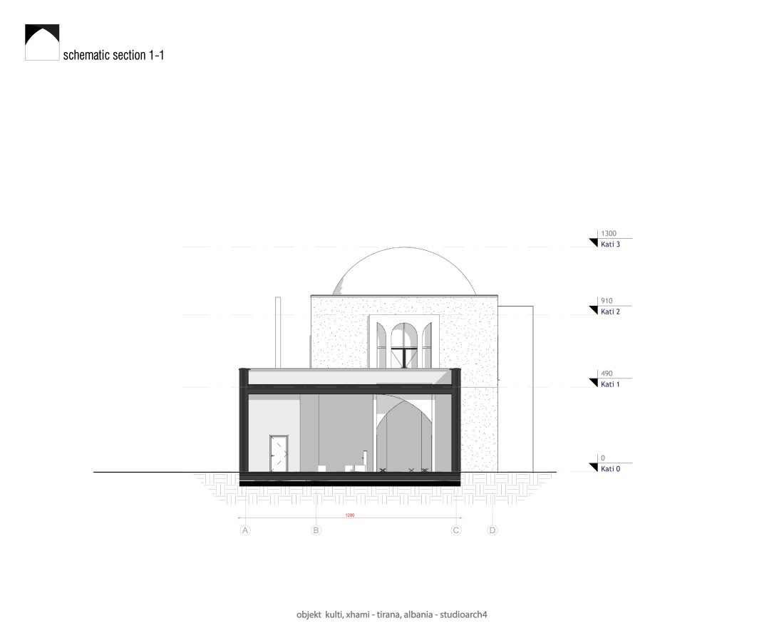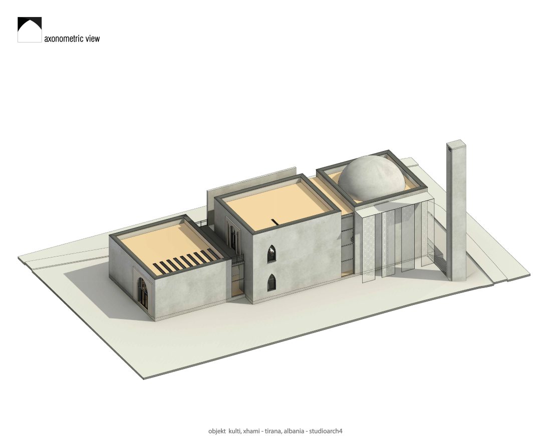 kompozohet në 3 volume kubike, në lartësinë 1, 2 dhe 3 kate, i cili përkon edhe me kupolën.