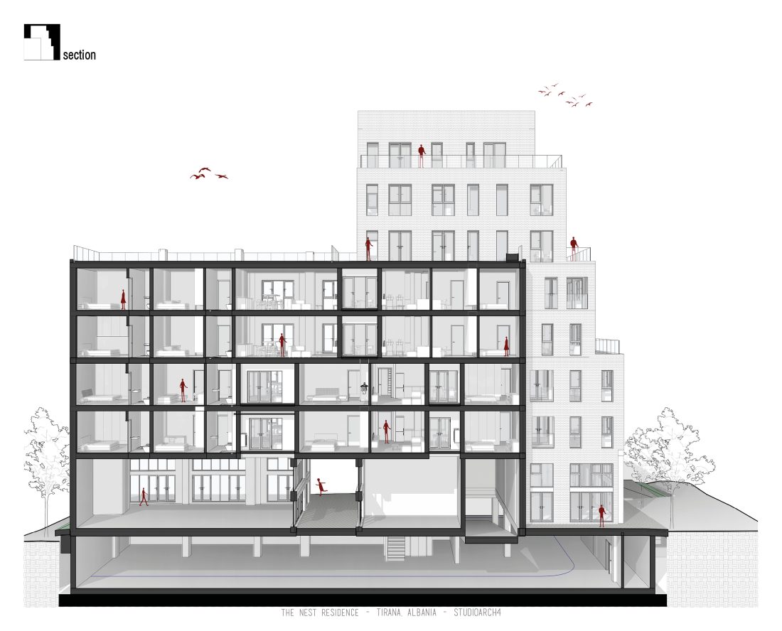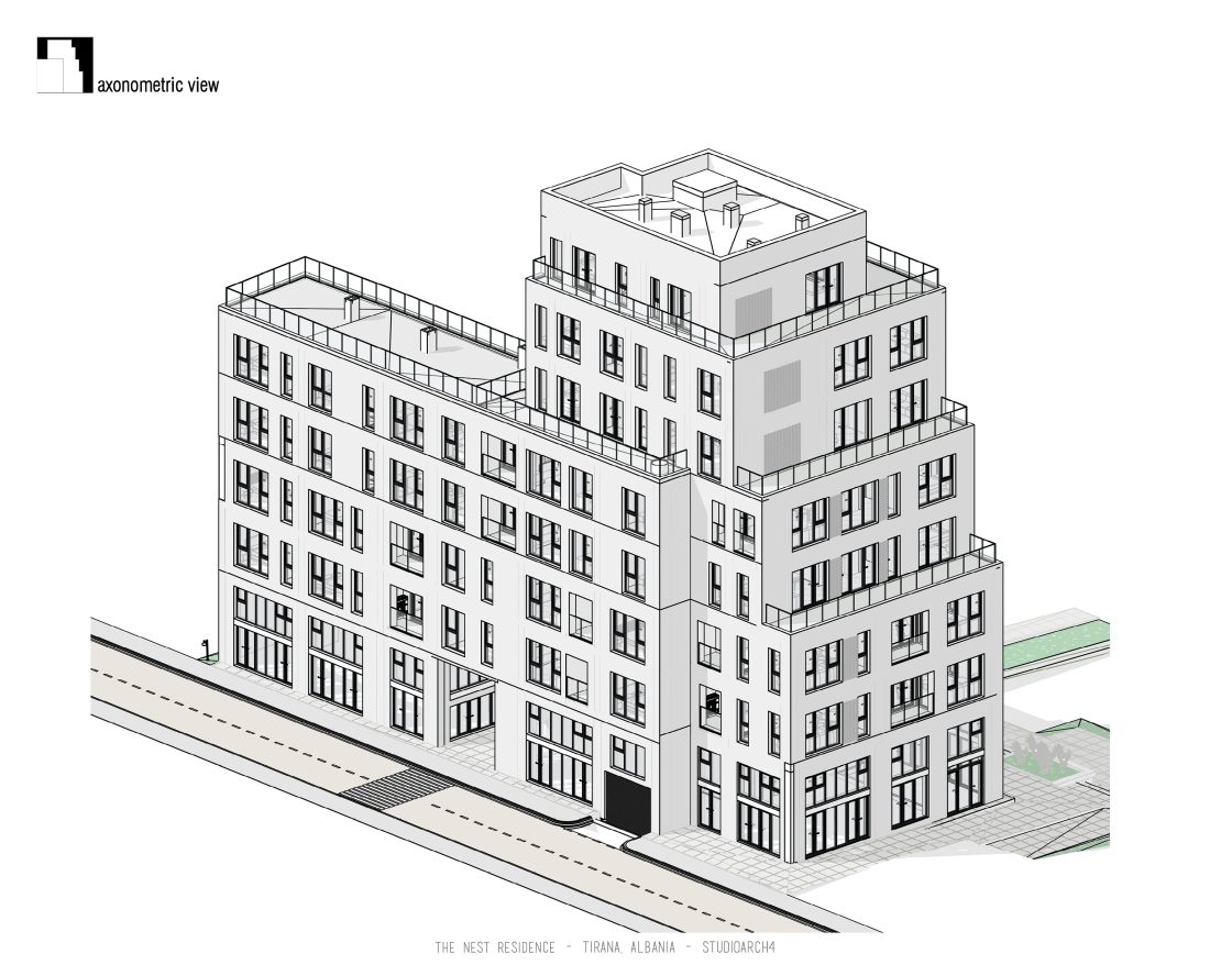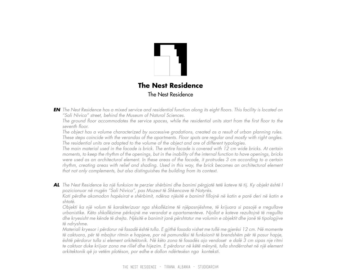 The Nest Residence ka një funksion te perzier shërbimi dhe banimi përgjatë tetë kateve të tij. Ky objekt është I pozicionuar në rrugën “Sali Nivica”, pas Muzeut të Shkencave të Natyrës.