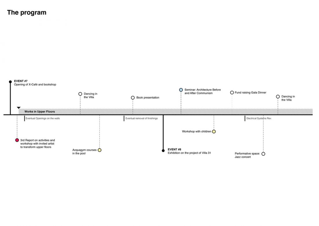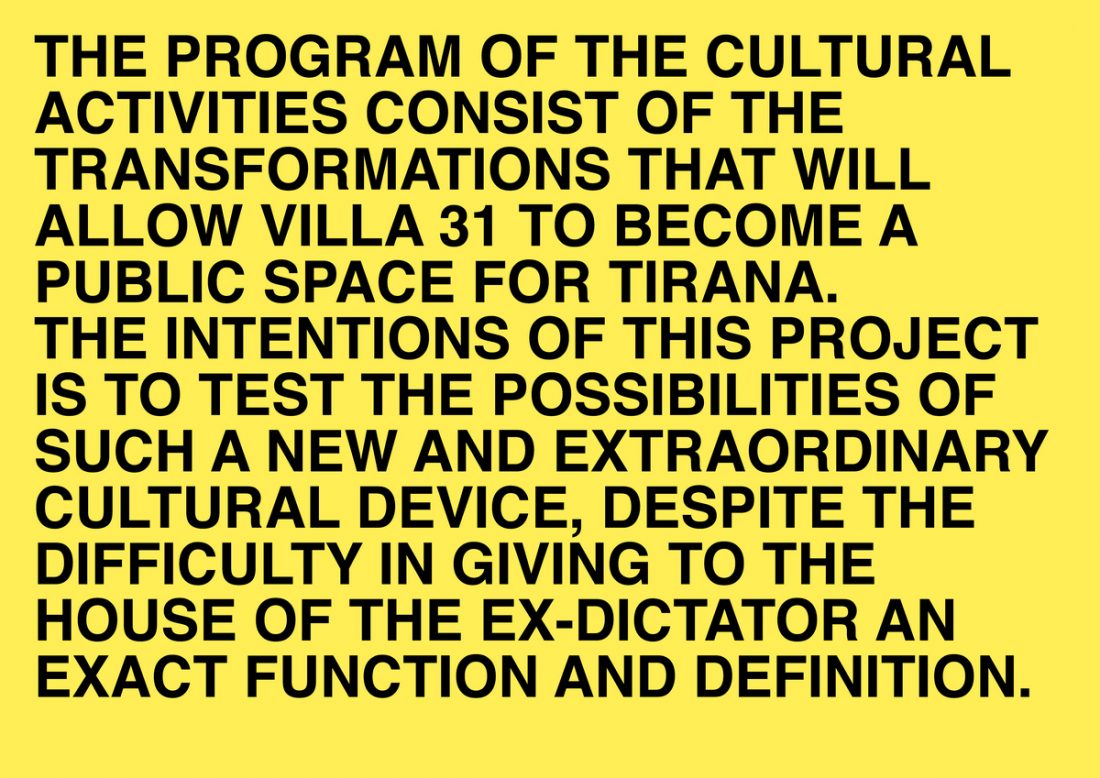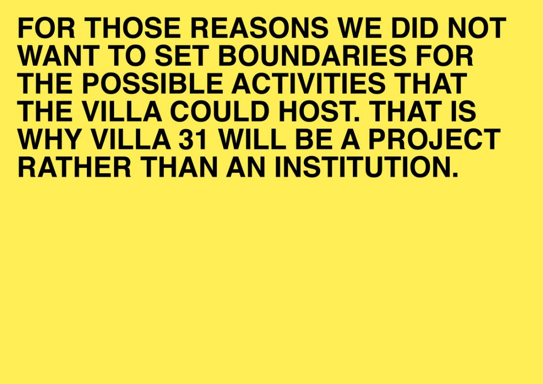 The intentions of this project is to test the possibilities of such a new and extraordinary cultural device, despite the difficulty in giving to the house of the ex-dictator an exact function and definition. For those reasons we did not want to set boundaries for the possible activities that the Villa could host. That is why Villa 31 will be a project rather than an institution.
