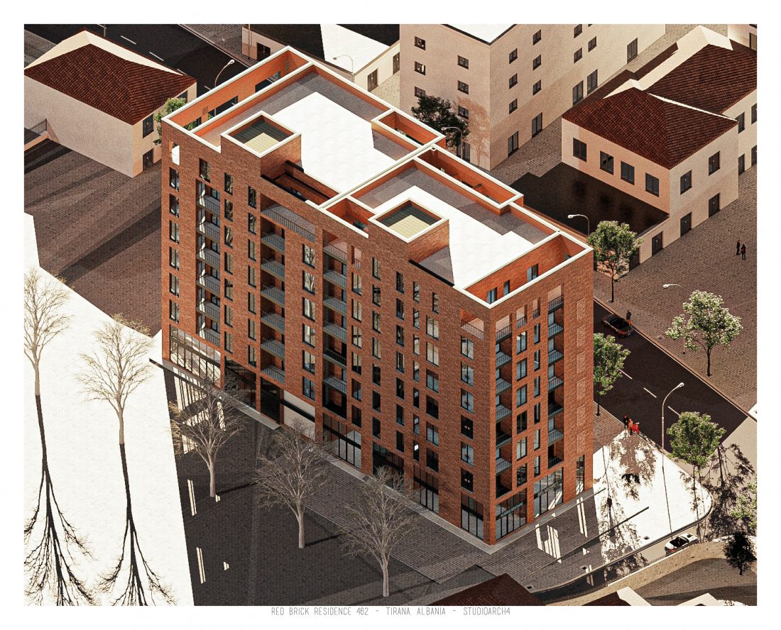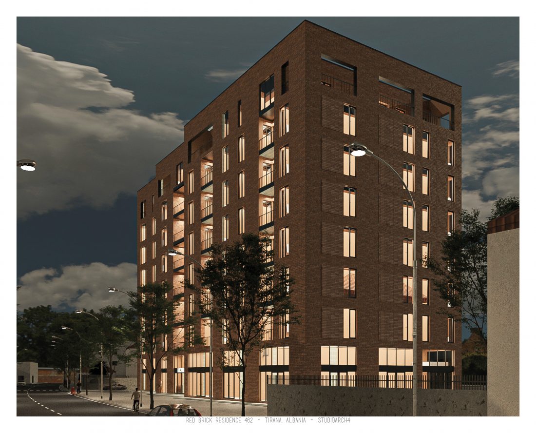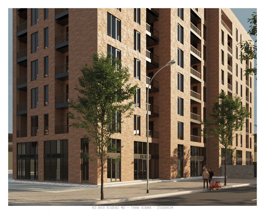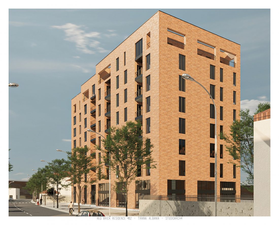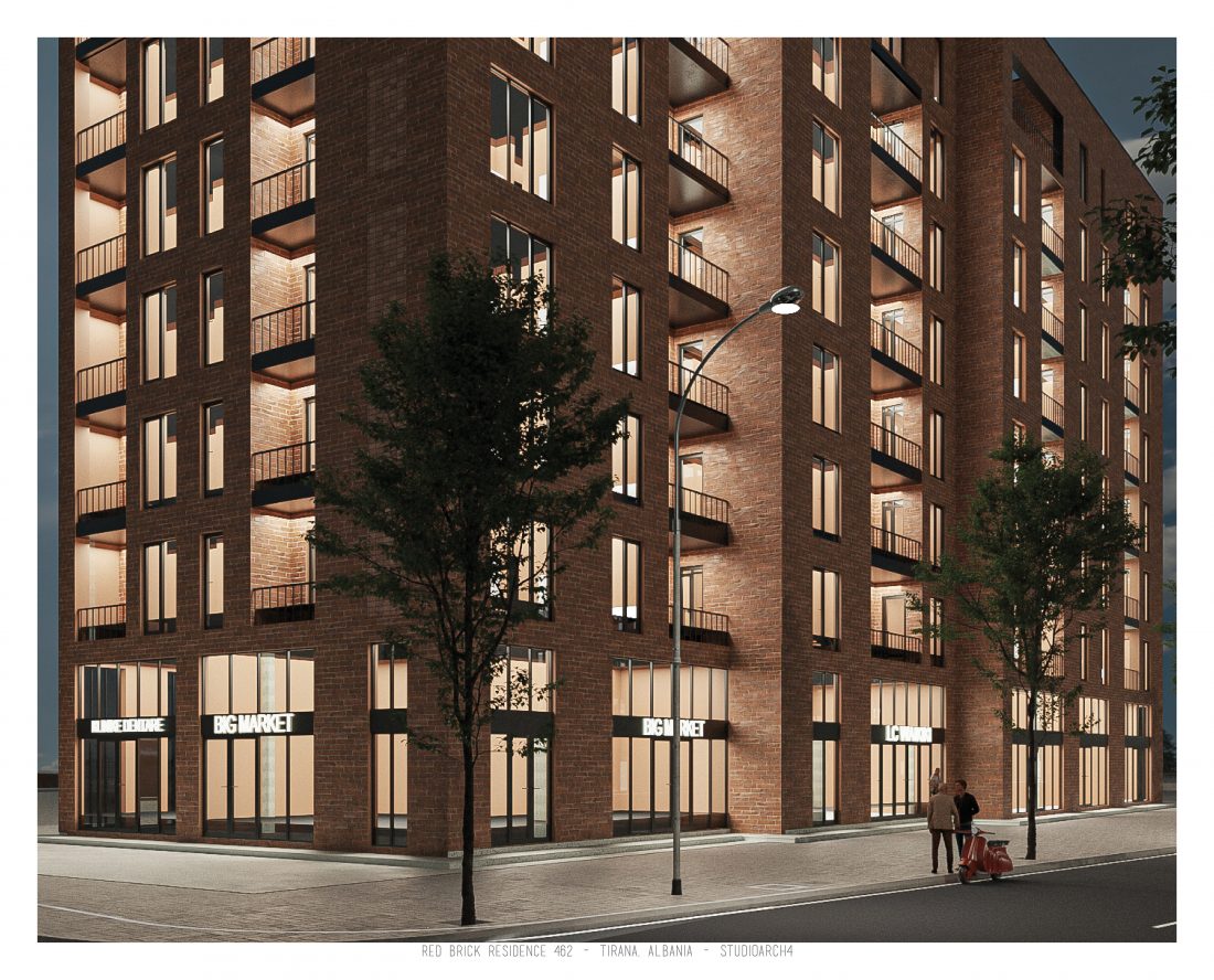 The building has mixed functions, residential and service units with a height of seven and eight floors above ground and two floors underground. The services are concentrated on the ground floor and have a surface of about 765 m². The object is located in Tirana on “Kahreman Ylli” Street, where the longest side is oriented. The service units are facing the street where there is a flow of movement, while the residents’ entrance and the entrance to the parking lot, the stair/elevator block and the electrical cabin are located at the back. From the first floor to the seventh floor, the building is residential.There are 8 apartments on each the floor. Each of the apartments has ample space and at least one loggia. The object has a regular geometric shape, with right angles and without going outside the contour of the facade. The spot has a section width of 16 and 18 m and a length of 46 m. The facade of the building is designed with brick cladding, thus making a volume connection. To make a difference, the soles of the lodges have been treated with black metal coating. Likewise, the parapets will have black metal elements.