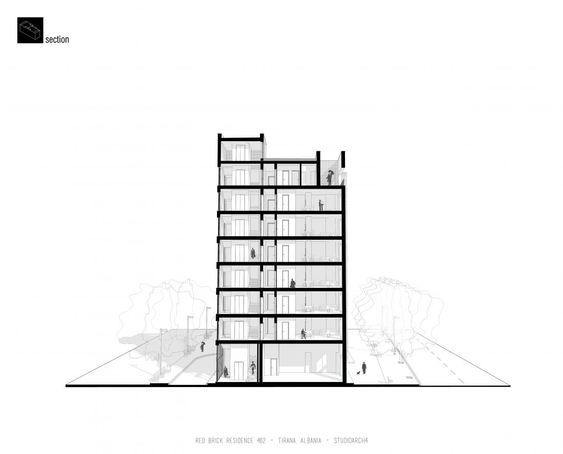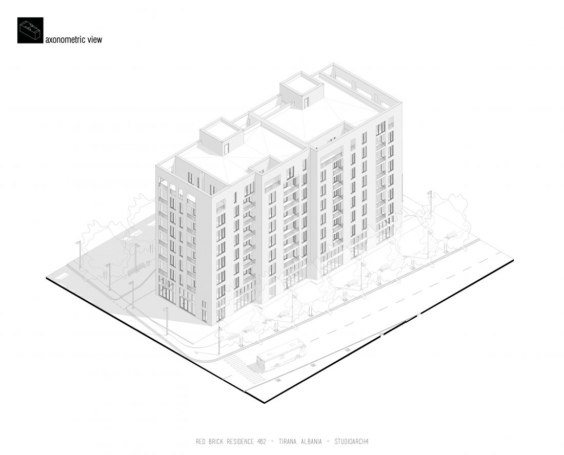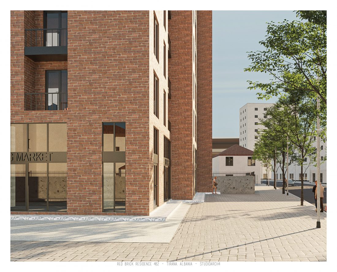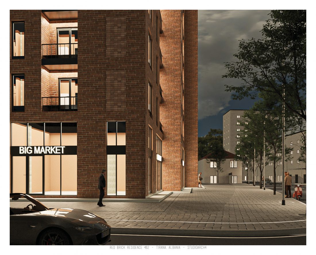 The building has mixed functions, residential and service units with a height of seven and eight floors above ground and two floors underground. The services are concentrated on the ground floor and have a surface of about 765 m². The object is located in Tirana on “Kahreman Ylli” Street, where the longest side is oriented. The service units are facing the street where there is a flow of movement, while the residents’ entrance and the entrance to the parking lot, the stair/elevator block and the electrical cabin are located at the back. From the first floor to the seventh floor, the building is residential.There are 8 apartments on each the floor. Each of the apartments has ample space and at least one loggia. The object has a regular geometric shape, with right angles and without going outside the contour of the facade. The spot has a section width of 16 and 18 m and a length of 46 m. The facade of the building is designed with brick cladding, thus making a volume connection. To make a difference, the soles of the lodges have been treated with black metal coating. Likewise, the parapets will have black metal elements.