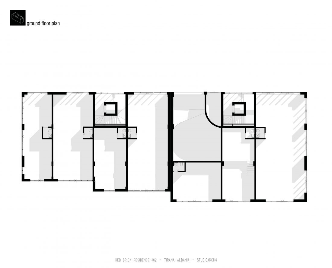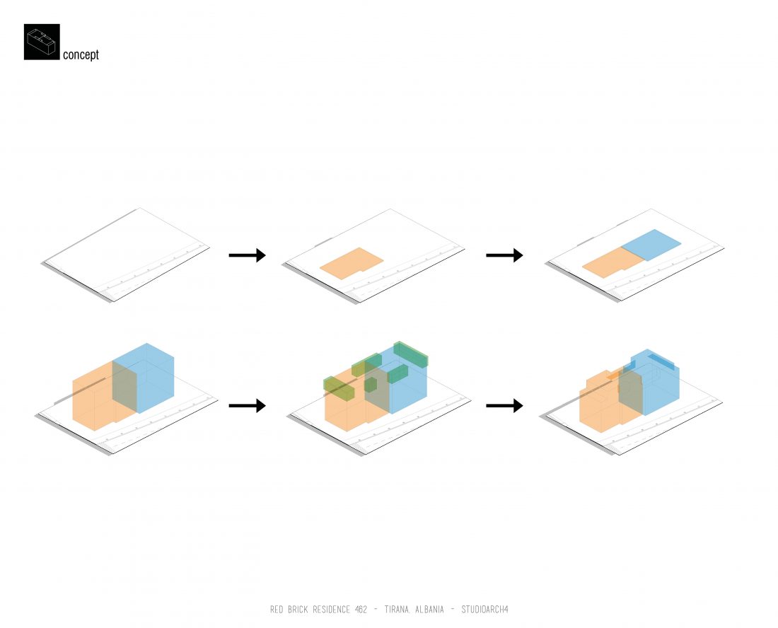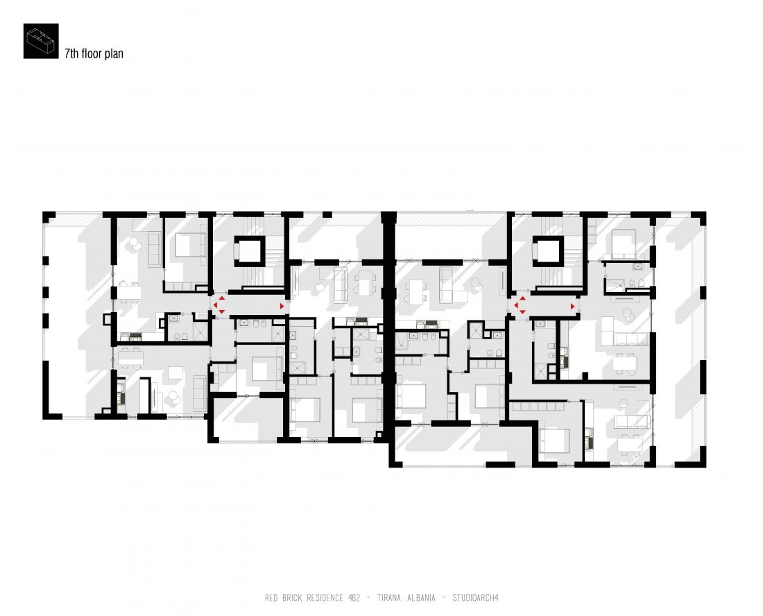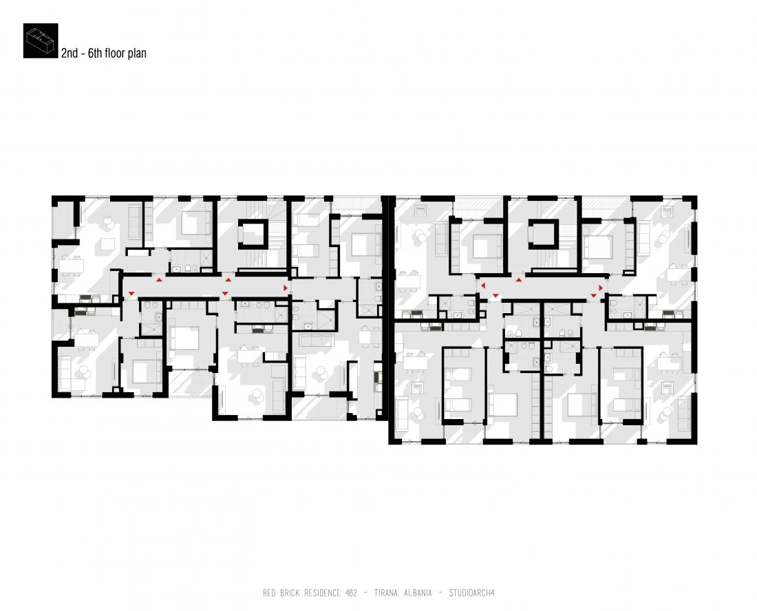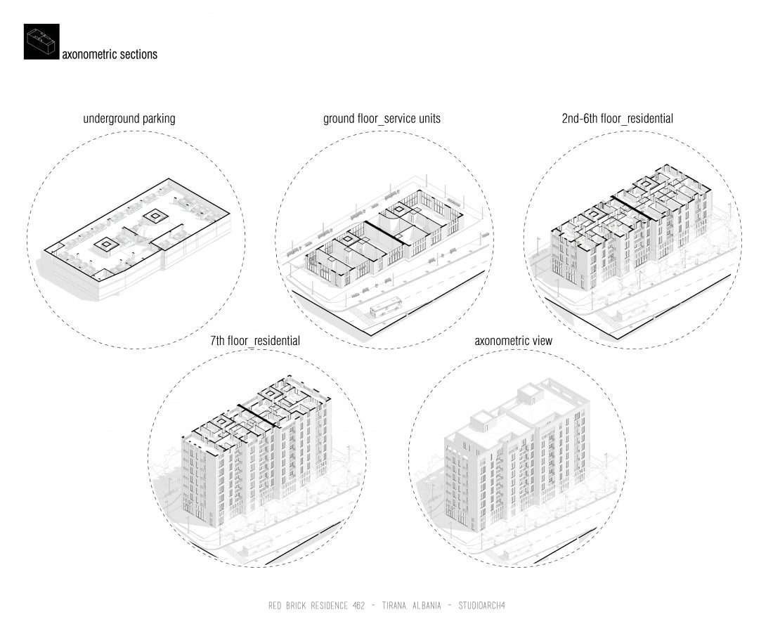 The building has mixed functions, residential and service units with a height of seven and eight floors above ground and two floors underground. The services are concentrated on the ground floor and have a surface of about 765 m². The object is located in Tirana on “Kahreman Ylli” Street, where the longest side is oriented. The service units are facing the street where there is a flow of movement, while the residents’ entrance and the entrance to the parking lot, the stair/elevator block and the electrical cabin are located at the back. From the first floor to the seventh floor, the building is residential.There are 8 apartments on each the floor. Each of the apartments has ample space and at least one loggia. The object has a regular geometric shape, with right angles and without going outside the contour of the facade. The spot has a section width of 16 and 18 m and a length of 46 m. The facade of the building is designed with brick cladding, thus making a volume connection. To make a difference, the soles of the lodges have been treated with black metal coating. Likewise, the parapets will have black metal elements.