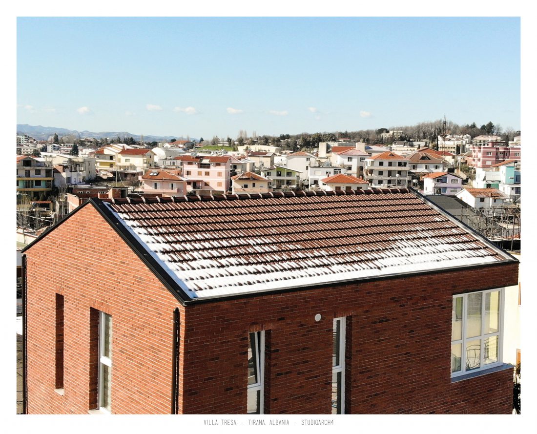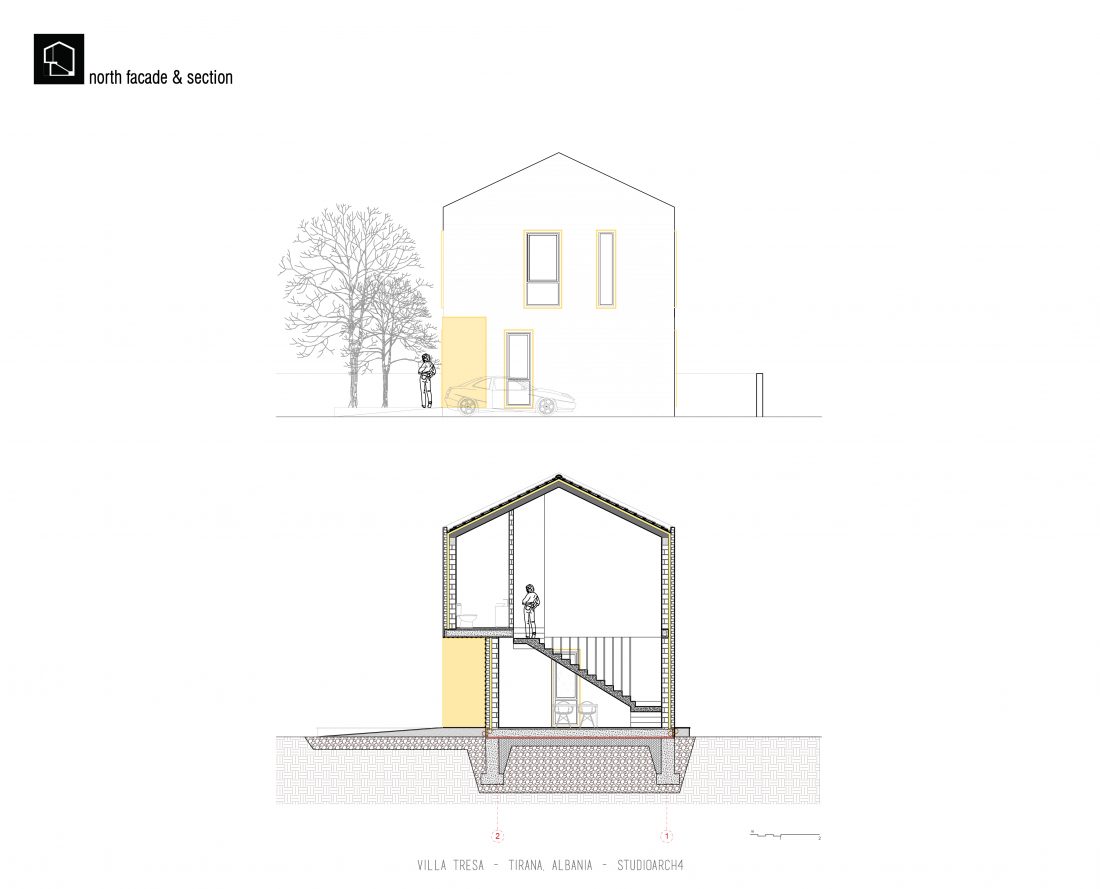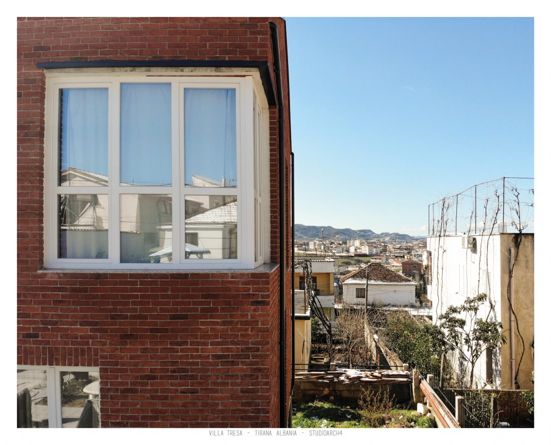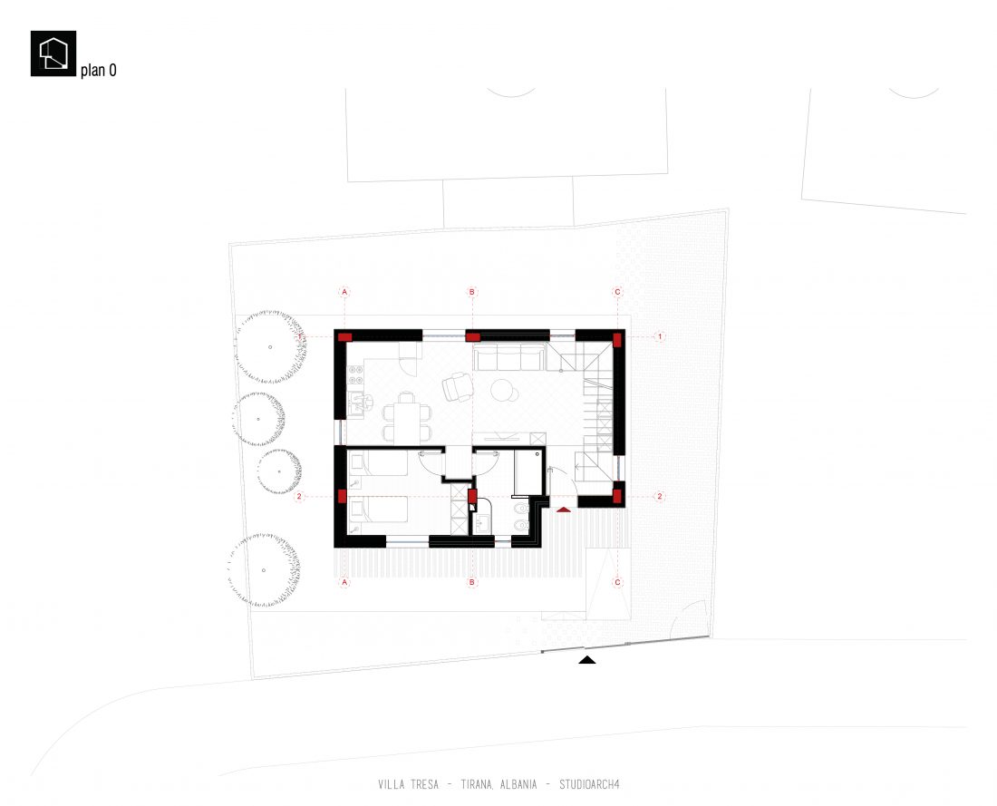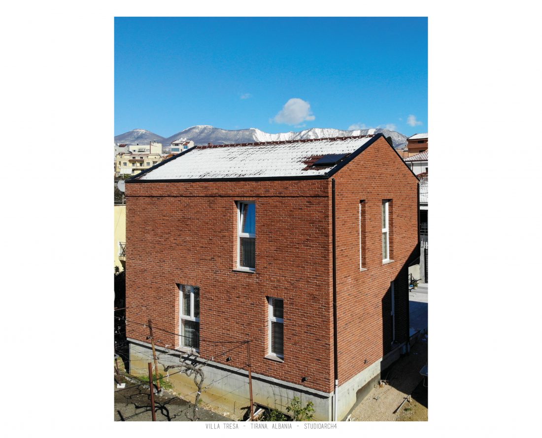 Volumi i ndërtesës është i pastër dhe thyhet vetëm nga çarjet në fasadë të cilat janë sa lartësia e katit. Në katin përdhe, hyrja bëhet në faqen lindore të ndërtesës. Këtu, edhe volumi i ndërtesës tërhiqet për ta theksuar hyrjen. Një efekt i ngjashëm është krijuar edhe në katin e parë në faqen jug-lindore, jo me ndërprerjen e volumit, por me vendosjen e dritareve në këndin jug-lindor të objektit.