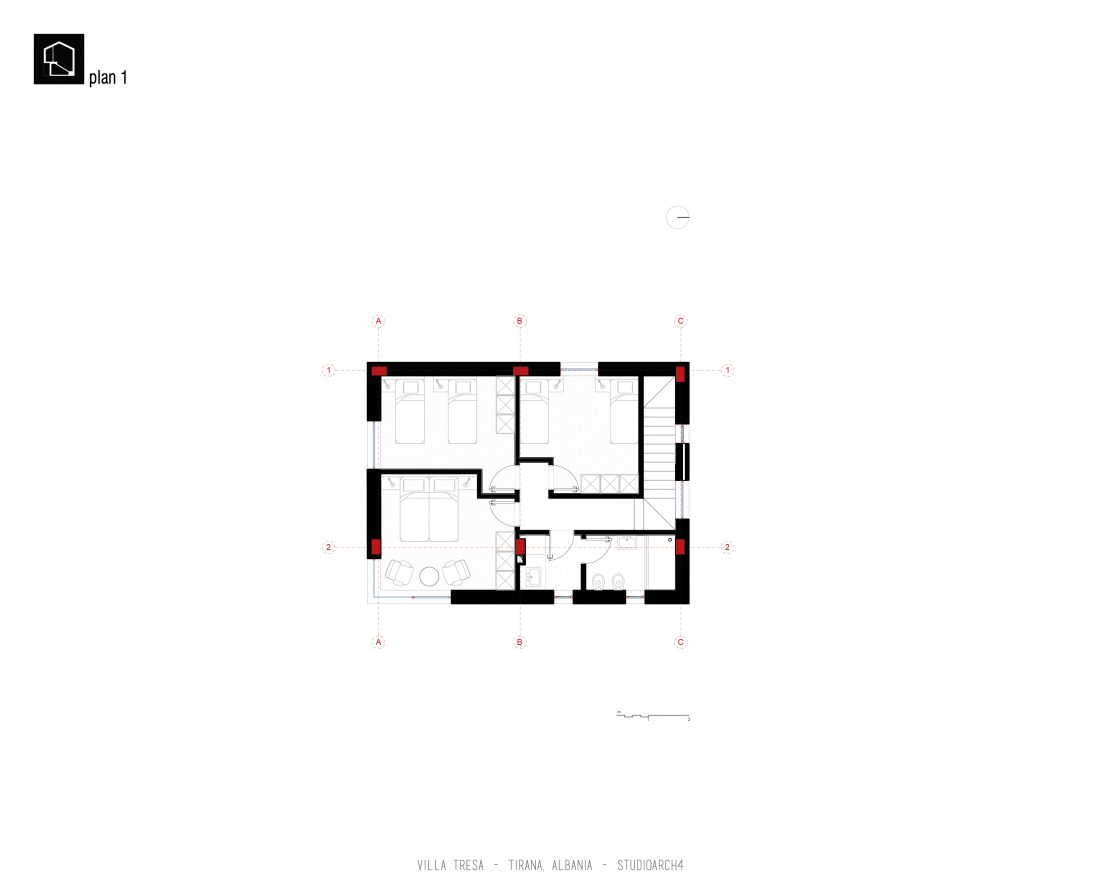 Shpërndarja e funksioneve është e tillë që hapësira e ndenjes, ngrënies, gatimit dhe një dhomë gjumi janë në katin përdhe, ndërsa dhomat e tjera të gjumit në katin e parë. Secili kat ka nga një tualet.