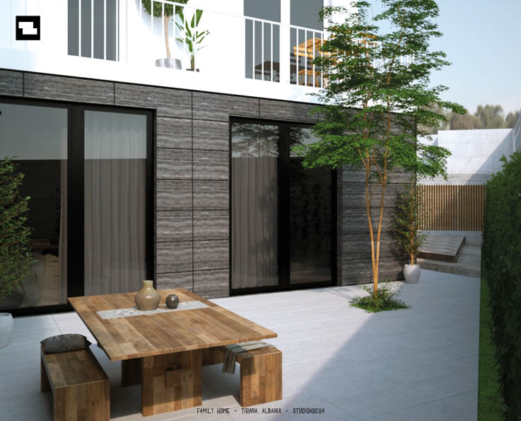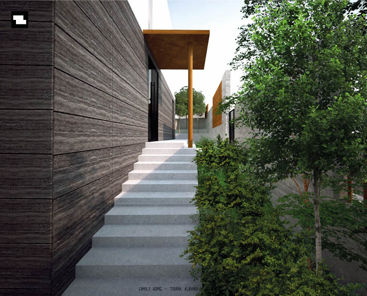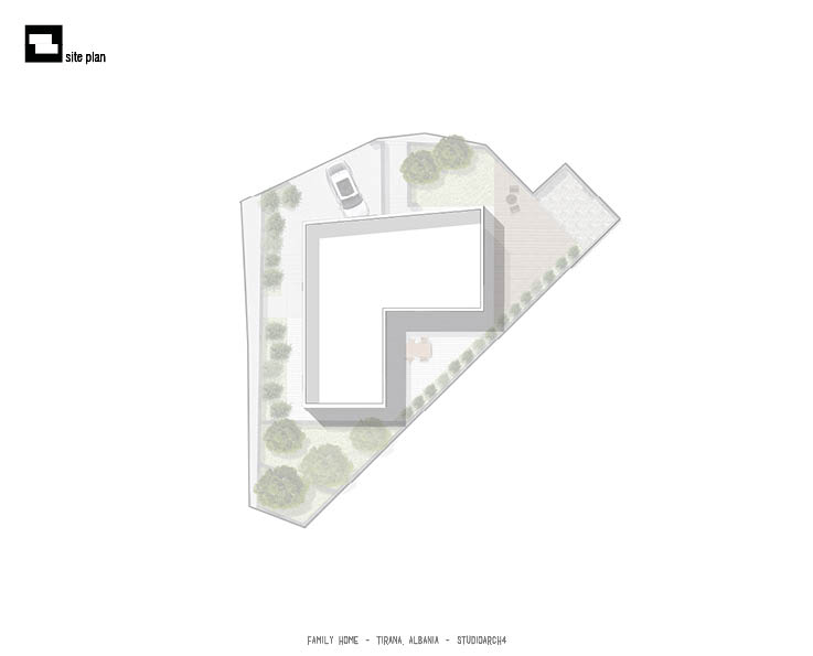 Objekti eshte i vendosur ne mes te prones dhe eshte i orientuar me fasade kryesore nga rruga. Oborri i brendshem eshte i onturuar nga forma L e objektit dhe eshte me privat. Oborret rrethuese te objektit jane konceptuar me tarrace dhe ndjekin pjerresine e tokes. Ne forme objekti ruan pasterti dhe volum te rregullt me nje sfazim te katit te siperm me te poshtmin.