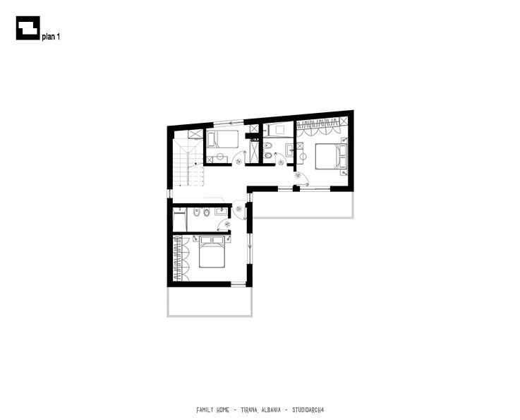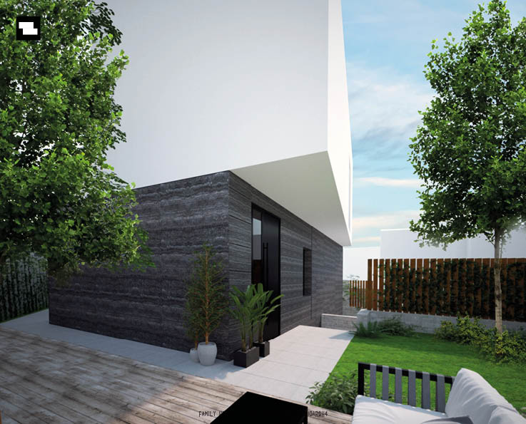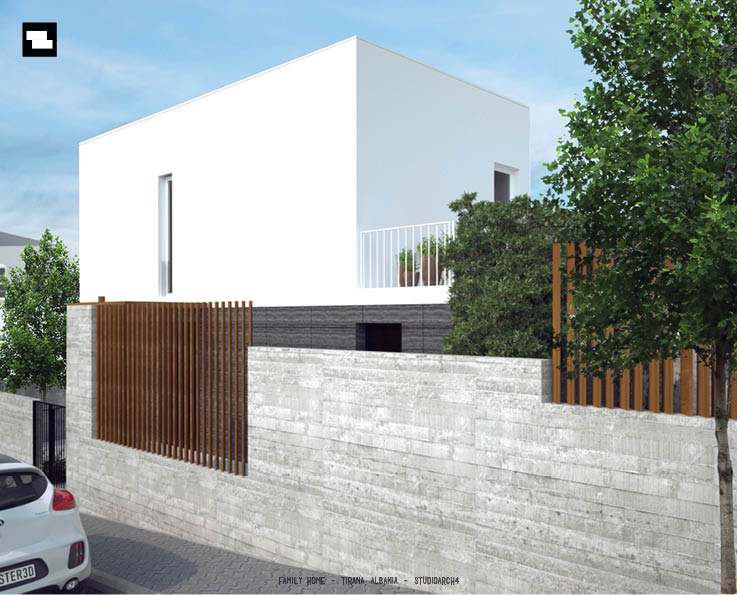 The building is located in the middle of the site. The main façade faces the road while the inner gardens are more protected through the L shape of the building thus creating a further private space for the family to use. The gardens are terraced following the slope of the land itself. The building has a clean geometrical shape where the first floor slides over the first one.